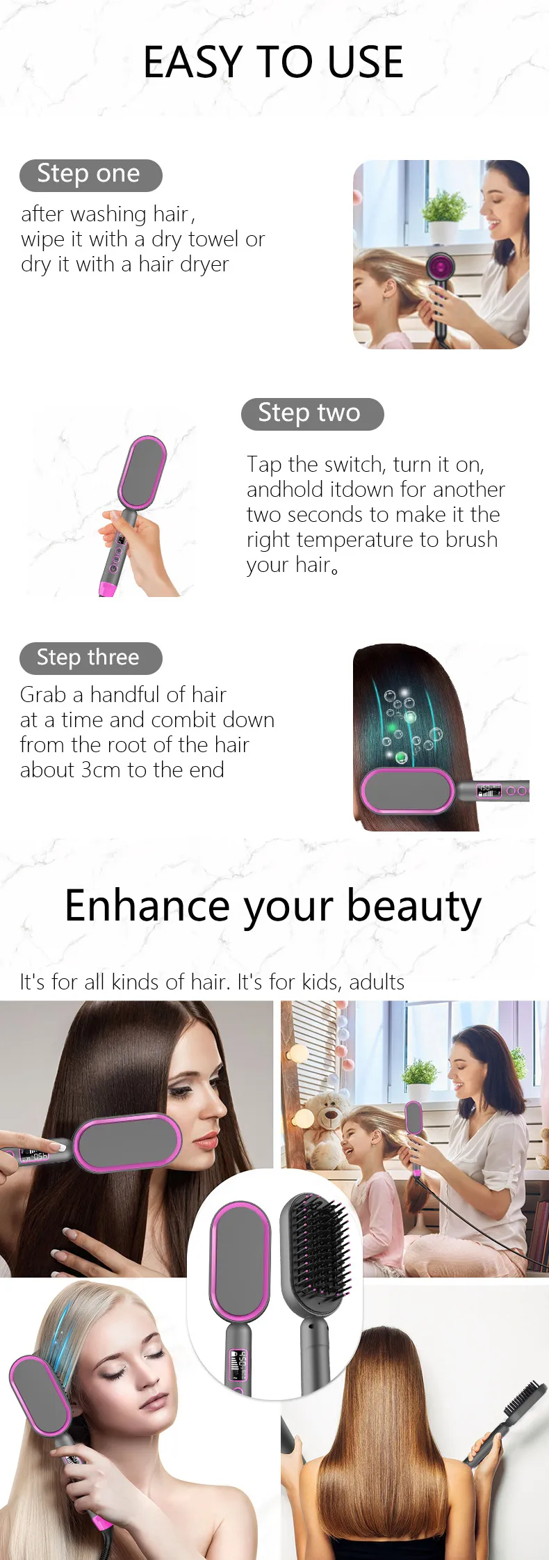 Using this multifunctional hair dryer is straightforward, whether you're straightening or adding volume to your hair. Here's how to use it: