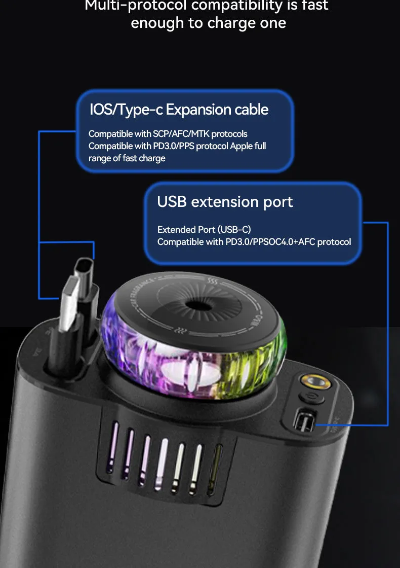 This charger not only powers your devices but also features USB ports for multiple connections, LED purple light indicators for visibility in the dark, and smart technology to protect against overcharging, overheating, and short circuits.