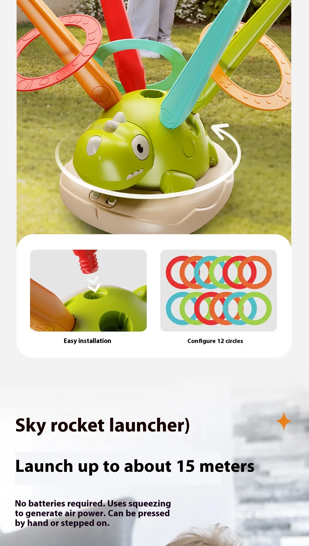 The Multifunctional Three-in-one Dinosaur Exercise Machine is a versatile and engaging sports toy designed for children who love to stay active and enjoy fun physical challenges. This exciting, multi-functional toy combines ring throwing, skipping rope, and a skyrocket feature in one compact, easy-to-use machine. Whether it’s for indoor or outdoor play, this toy is perfect for keeping kids engaged while promoting physical health, coordination, and active play. Designed with a vibrant dinosaur theme, it captures children's attention and encourages them to enjoy exercising through play.