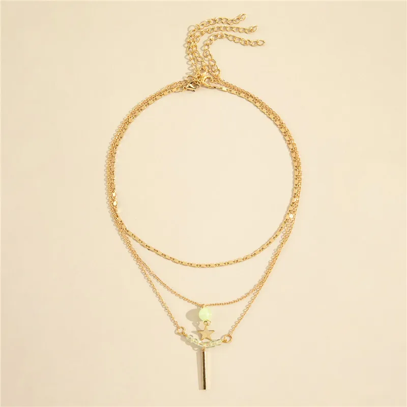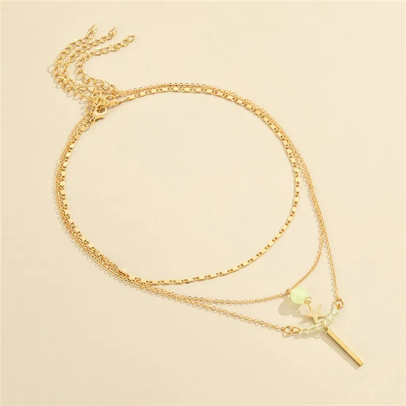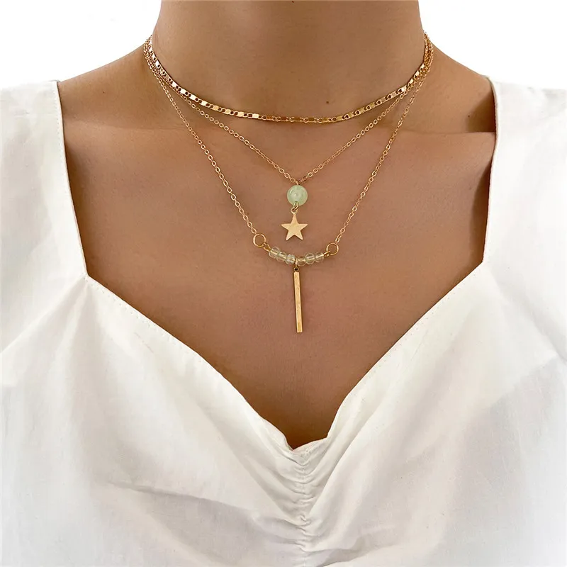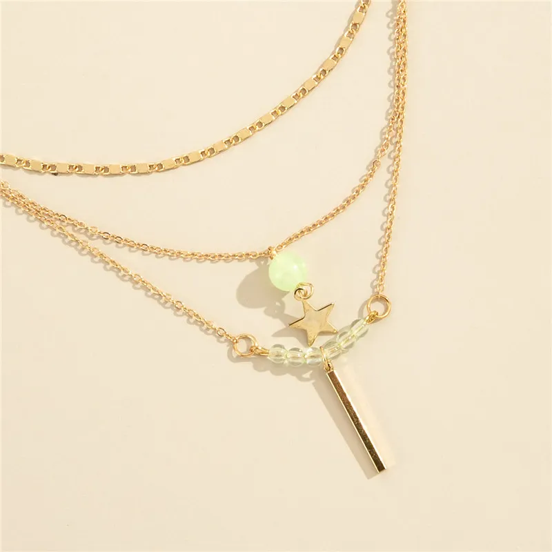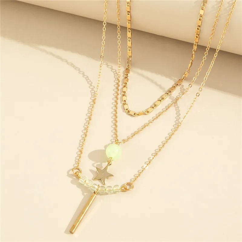 Multilayer Five-pointed Star Long Pendant Necklace Round Bead Chain Three-piece Set