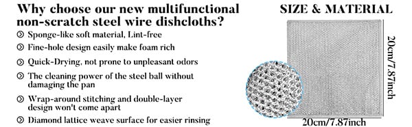All-purpose Wire Dishwashing Rag is durable and reusable and can be used to wipe kitchenware, cars, electronics, glasses, jewelry, stainless steel, home appliances, furniture, etc. Its efficient performance will make it just what your kitchen needs.