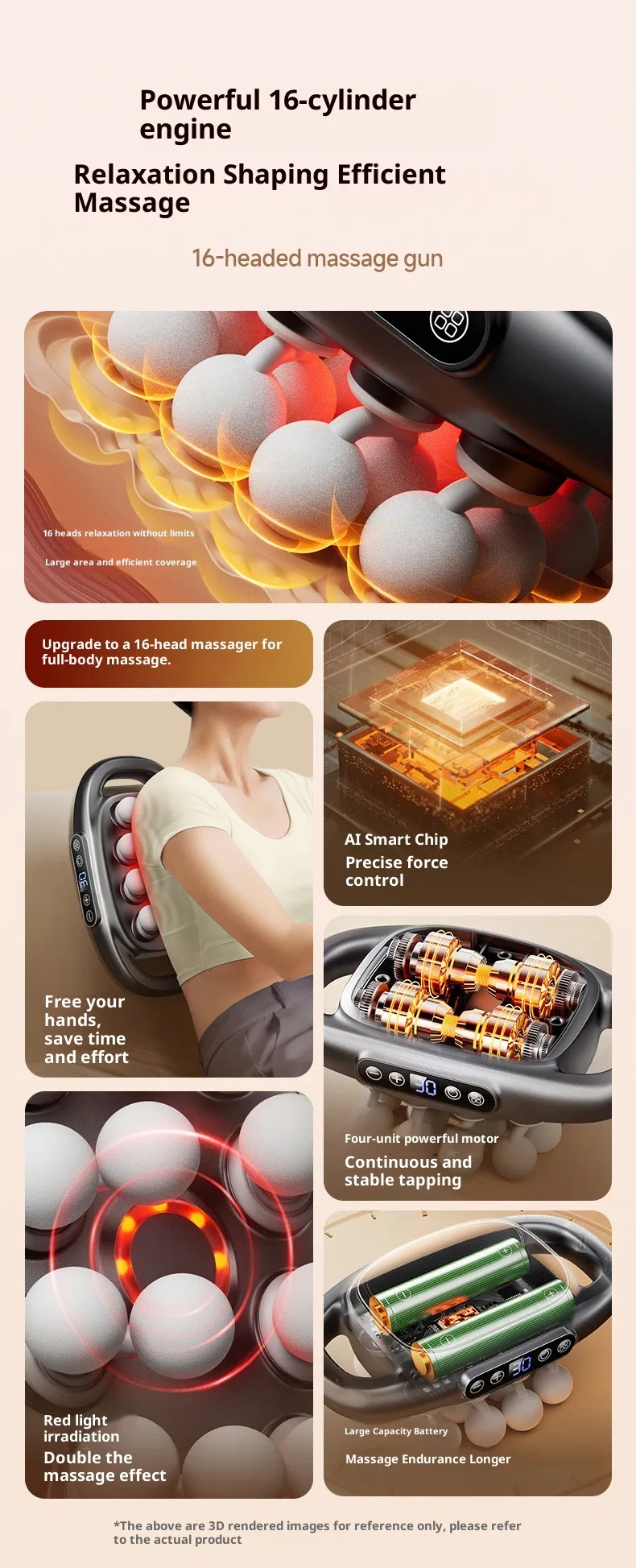 The Muscle Relaxation Massager is designed to deliver deep tissue relief using percussive therapy, targeting muscle knots and tension with its high-powered vibration technology. Featuring 16 interchangeable heads, this massager allows you to choose the perfect attachment for specific body areas, such as the back, shoulders, legs, and feet, for a personalized massage experience.