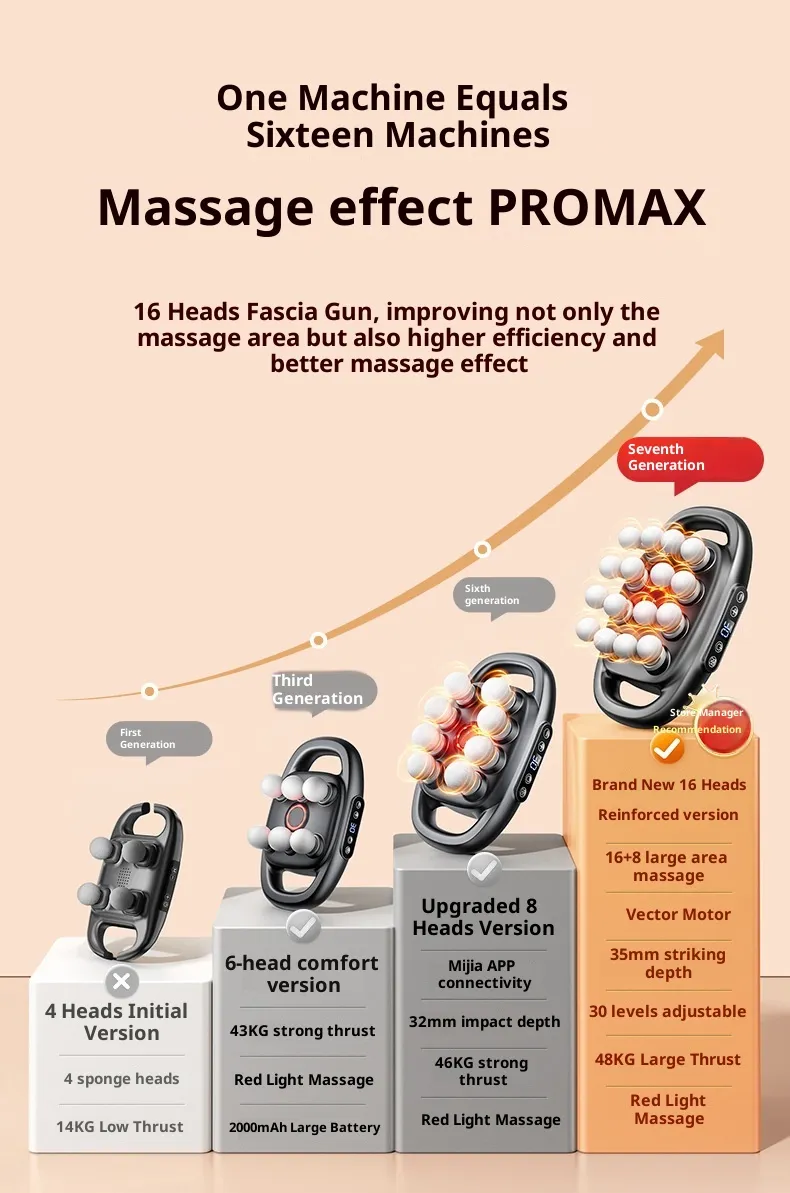 16 Interchangeable Heads: Offers a variety of head attachments designed for specific muscle groups, allowing you to target