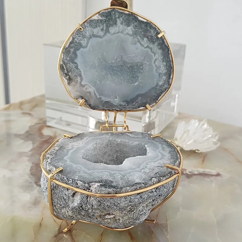 The jewelry box is made from authentic agate geodes, known for their vibrant colors and intricate patterns. Each box is one-of-a-kind, with agate stones displaying unique variations in color, texture, and crystal formations. The natural beauty of the agate is enhanced by the geode's interior, which often features a sparkling crystal cavity that adds an element of mystery and elegance to the piece.