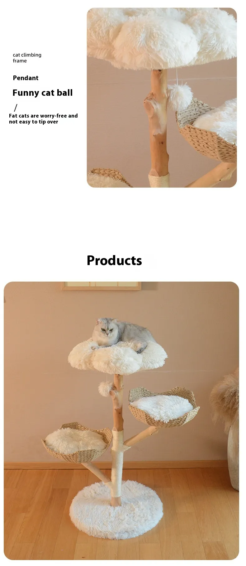 Introducing the Natural Fruit Tree Cat Climbing Frame, a meticulously handcrafted piece designed to enrich your feline friend's environment while seamlessly blending with your home decor. This unique cat tree combines solid wood construction with rattan elements, offering both durability and aesthetic appeal.