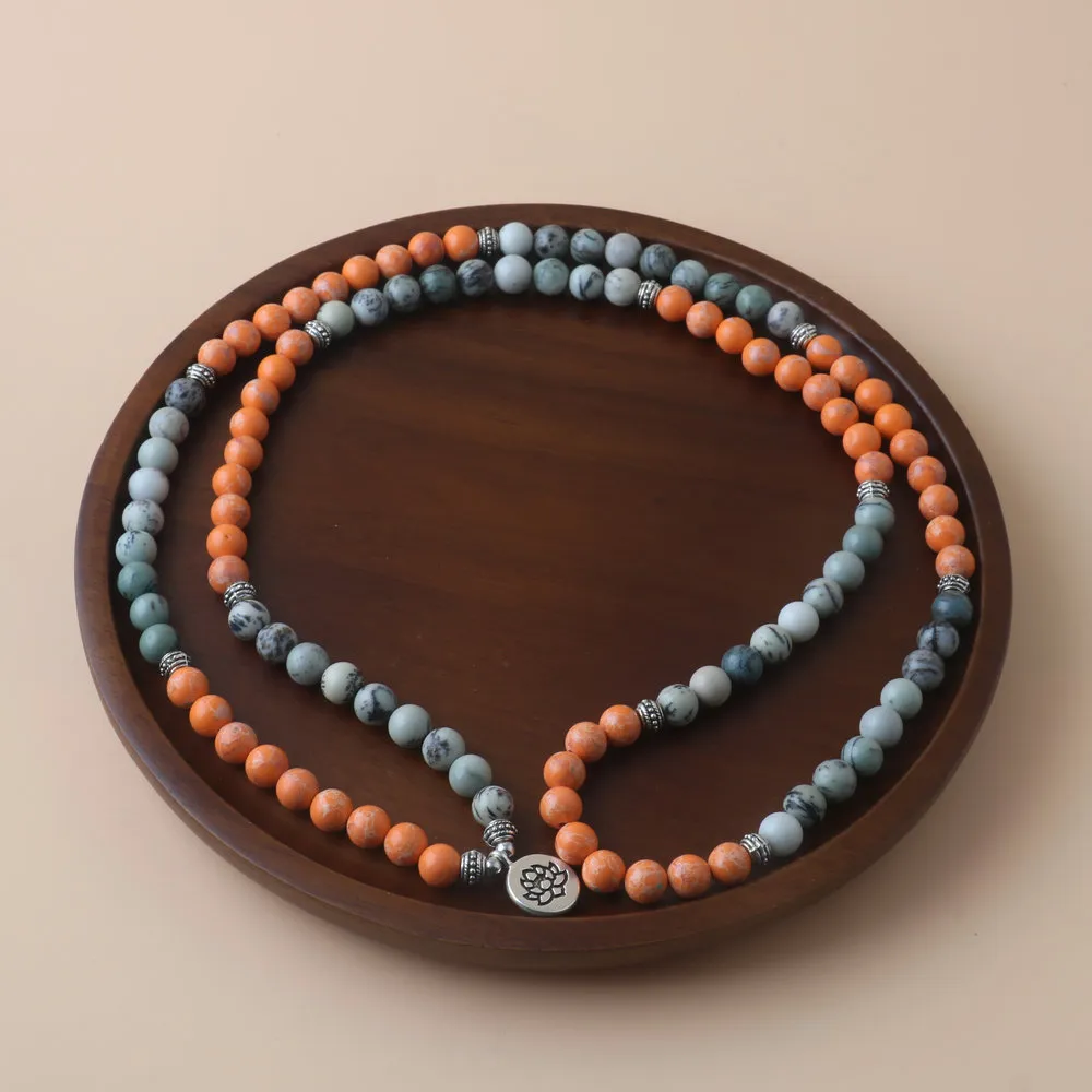 This rosary bracelet necklace features 108 natural stone beads, which are traditionally used in mala necklaces to count mantras or affirmations during meditation or prayer. The number 108 holds deep significance in many spiritual traditions, particularly in Hinduism, Buddhism, and Yoga, where it is believed to represent the 108 human afflictions and the process of purification through repetition of sacred words.Each bead is a tool for mindfulness, allowing you to focus and connect more deeply with your intention during meditation. Whether you're using the beads to repeat a mantra, set positive intentions, or simply stay present, the 108 beads provide structure and rhythm to your practice.