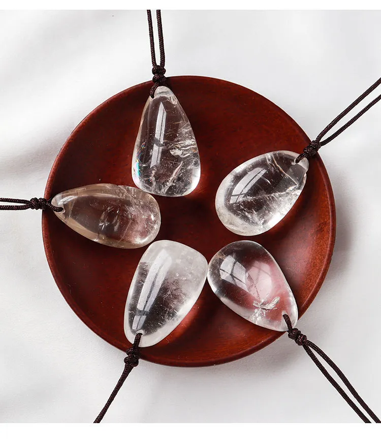Each pendant is crafted from genuine natural white crystal, ensuring that no two pieces are exactly alike. The drop-shaped design enhances its aesthetic appeal while symbolizing purity and spiritual awakening.