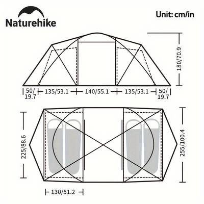 The NATUREHIKE 4-Person Large Family Camping Tent is a versatile and spacious tent designed to accommodate families or small groups on their outdoor adventures. The hexagonal shape maximizes internal space, providing two separate sleeping areas and a spacious living room with a front porch. Whether you're camping in spring, summer, or fall, this tent offers all-season protection to keep you safe and comfortable.