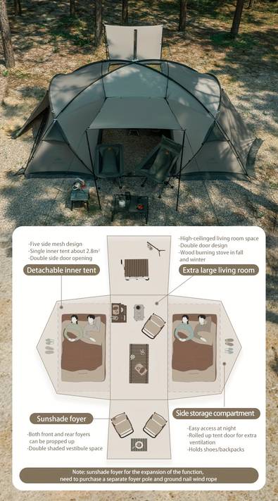 Stove-Compatible: Designed to accommodate a stove, making it ideal for cold-weather camping and providing warmth during