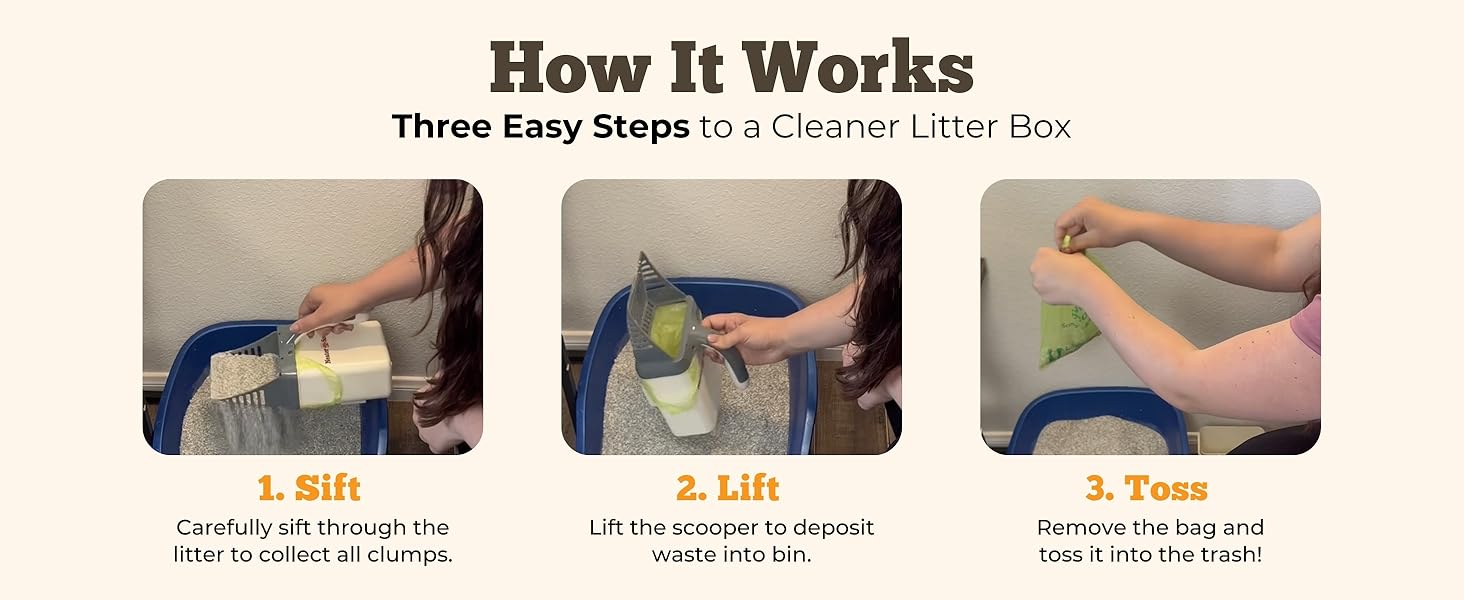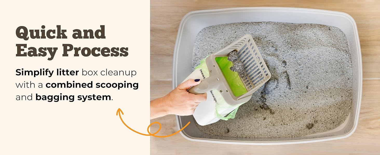 - EASY ONE-HANDED OPERATION: The ergonomic handle and scoop-to-bag design let you clean the litter box effortlessly with just one hand, making litter box maintenance easier at a fraction of the cost of an automatic litter box.