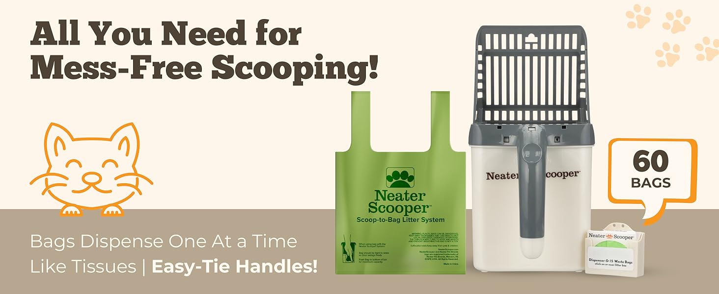 - REFILL BAGS & DISPENSER INCLUDED: Includes 60 tie-handle refill bags and a convenient dispenser that attaches to your litter box. The bags are custom-fit for the standard Neater Scooper. For refills, choose green Neater Scooper refill bags for a perfect fit.