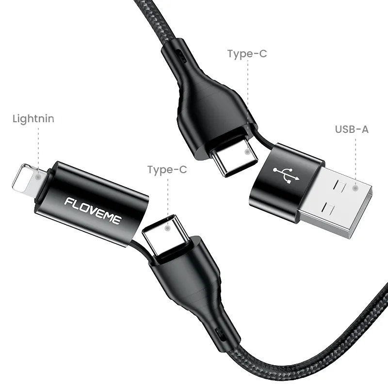 This cable includes four connector types — typically USB Type-C, Micro USB, and dual Lightning ports — allowing you to charge multiple devices at once. It’s the perfect universal solution for families, multi-device users, and workplaces.