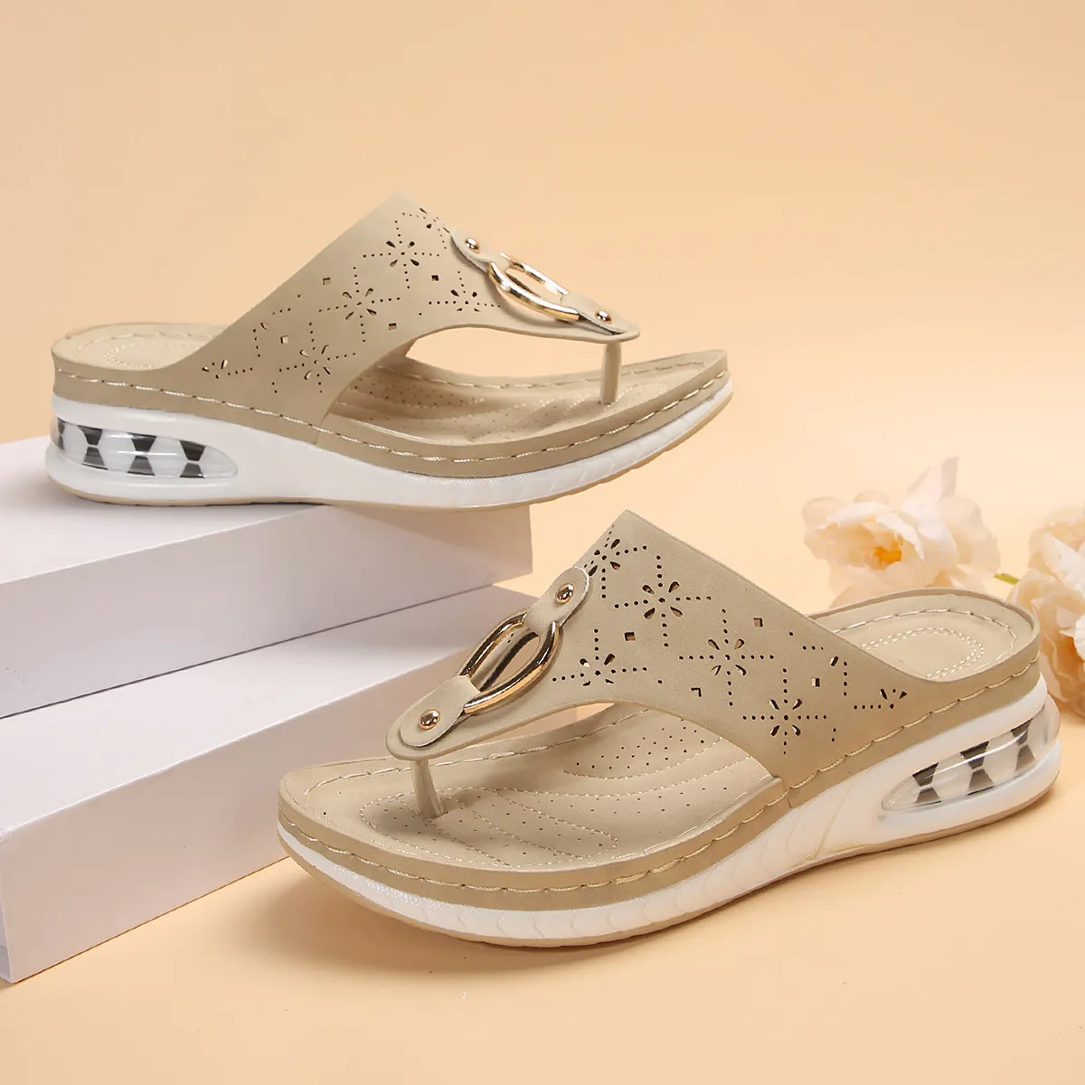 The hollow metal buckle adds a stylish accent to these thong-style sandals, giving them a modern and chic look. The flip-flop design offers a casual, easy-to-wear feel, while the wedge heel adds a touch of height without sacrificing comfort. The air cushion technology in the sole provides extra support, making these sandals ideal for long walks and extended wear.