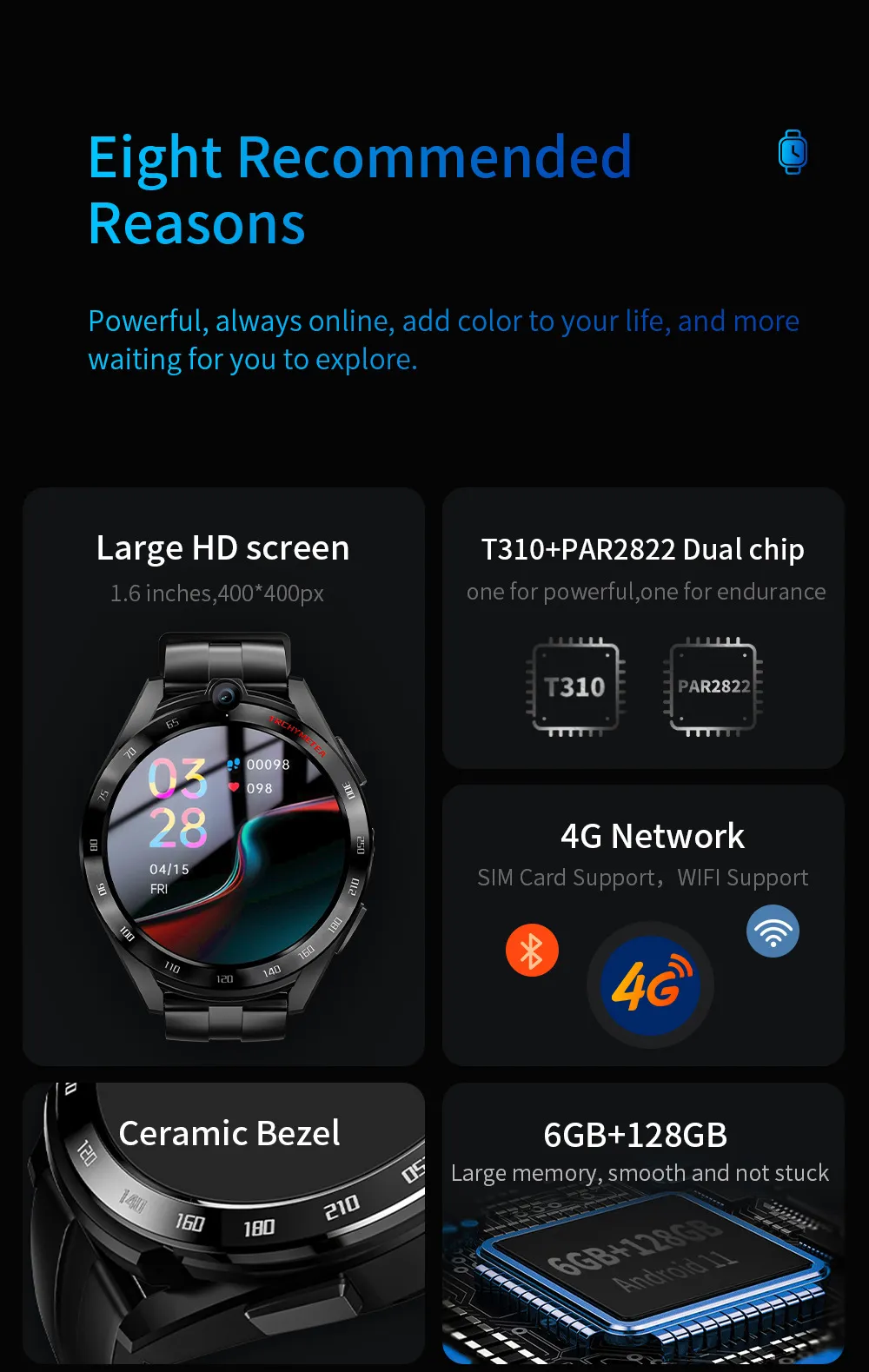 The 6GB RAM and 128GB storage ensure this watch handles demanding apps and multitasking with ease.