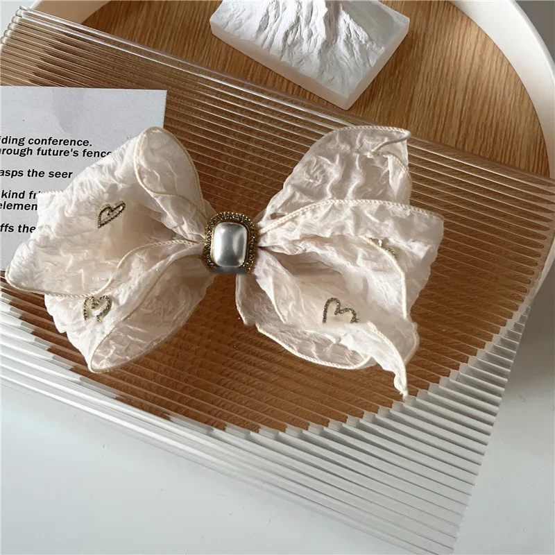 Color: Beige Heart Rhinestone Double Bow Lace Spring Clip, Black Heart Rhinestone Double Bow Lace Spring Clip
