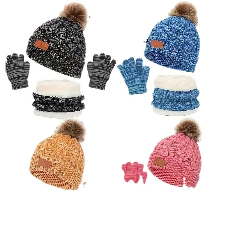 Each set includes a knitted hat, scarf, and gloves, providing full coverage to protect against the cold. The soft, stretchy knit material ensures a snug fit, while the fleece lining adds an extra layer of warmth.