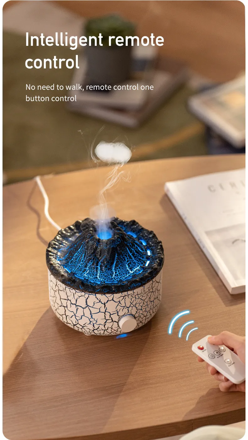 - The Volcano Humidifier features a dynamic Jellyfish Air Flame effect that simulates the movement of jellyfish in the water, creating a relaxing, otherworldly visual experience. This feature not only looks beautiful but also adds a calming element to any room.