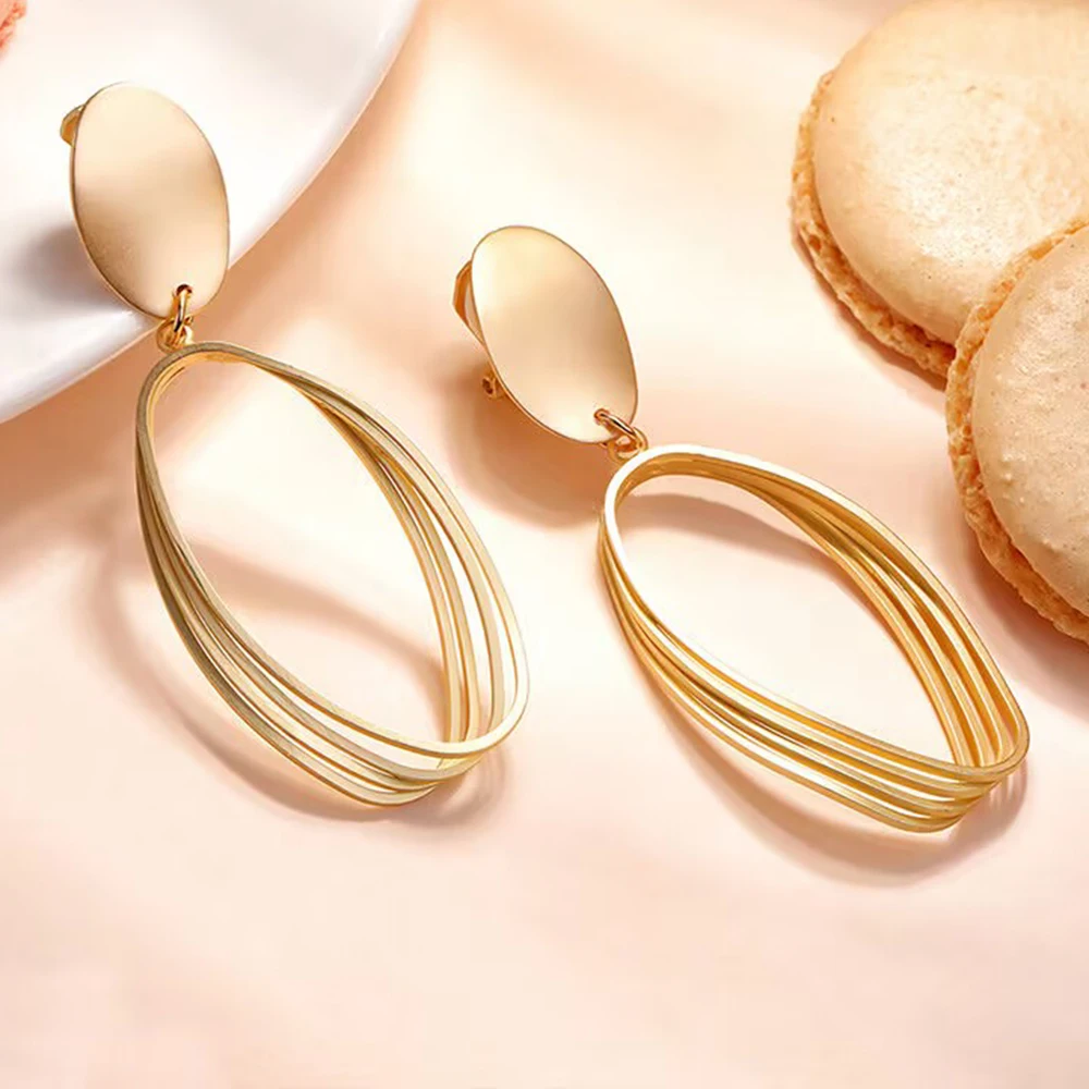 New Geometry Retro Metallic Gold Color Multiple Oval Pendant Clip Earrings