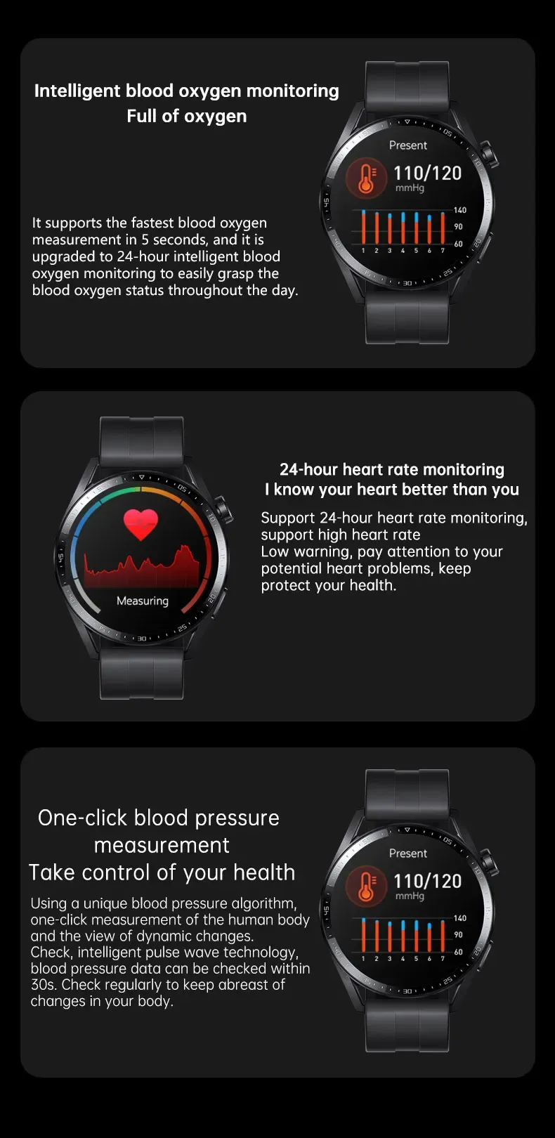 Comprehensive Health Tracking: Monitor your heart rate, blood pressure, and blood oxygen levels for a complete health