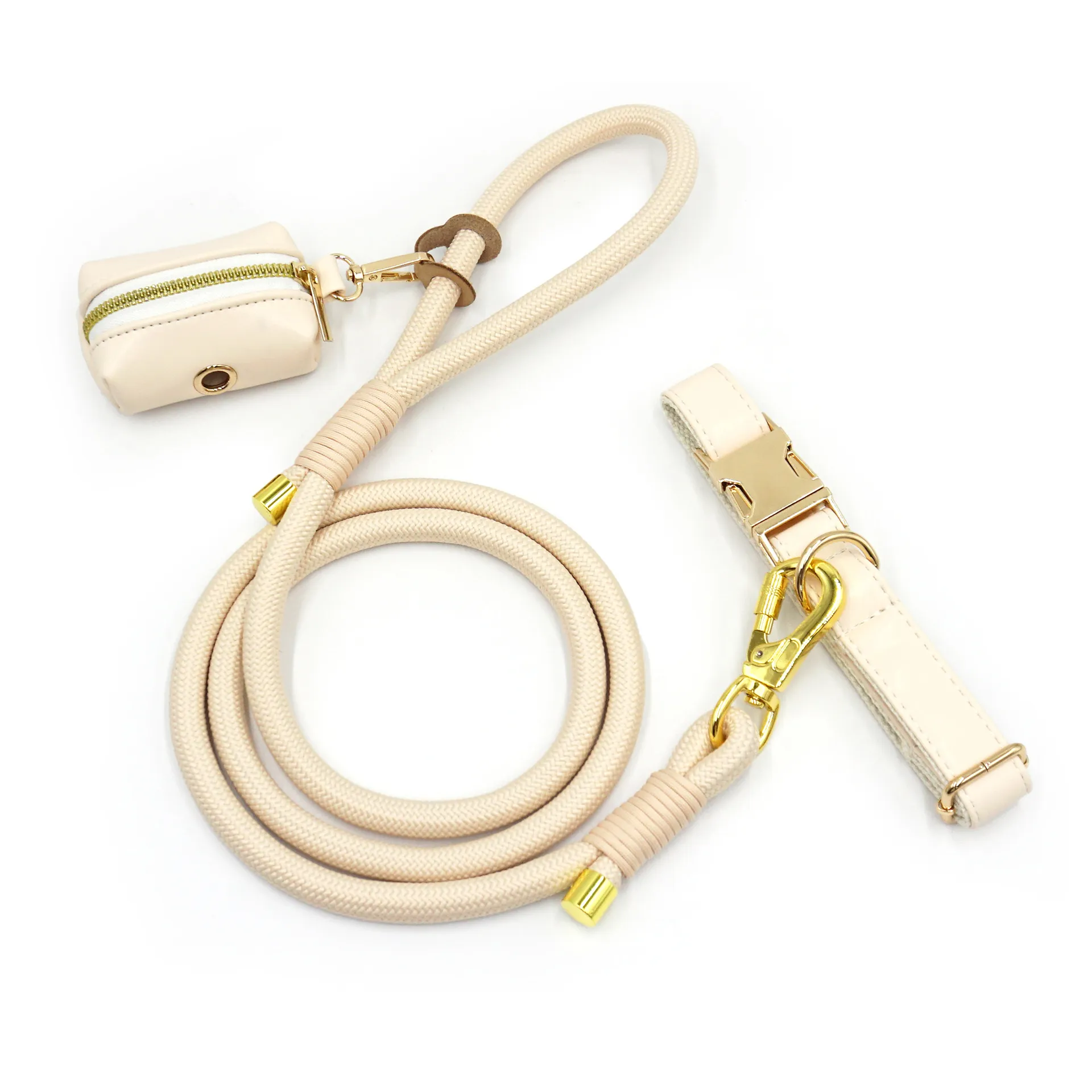 This leash features a hand-woven round rope construction, providing a comfortable grip and reducing strain on the hands during walks. The leather handle adds a touch of sophistication and ensures durability, making it suitable for daily use. The combination of materials offers a balance between strength and flexibility, accommodating dogs of various sizes and temperaments.