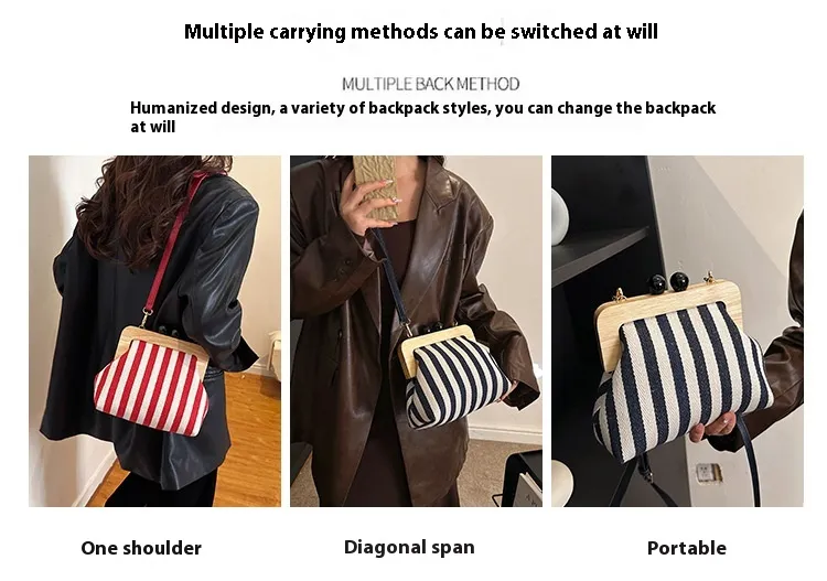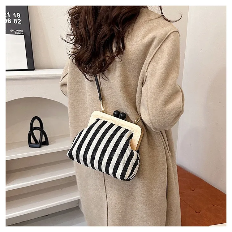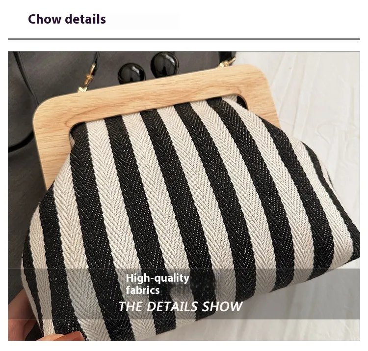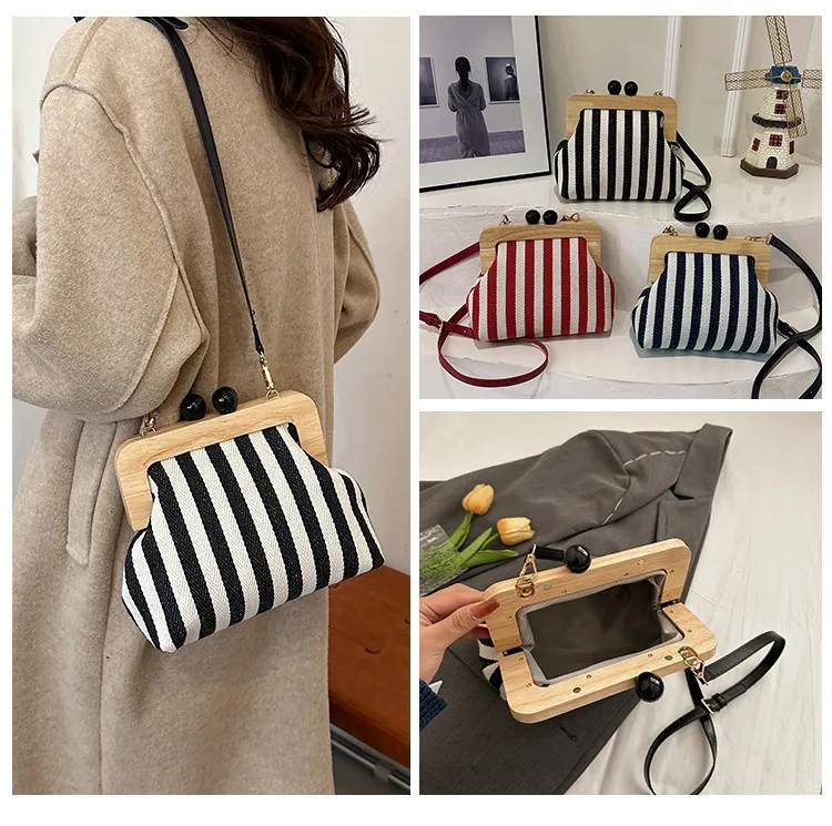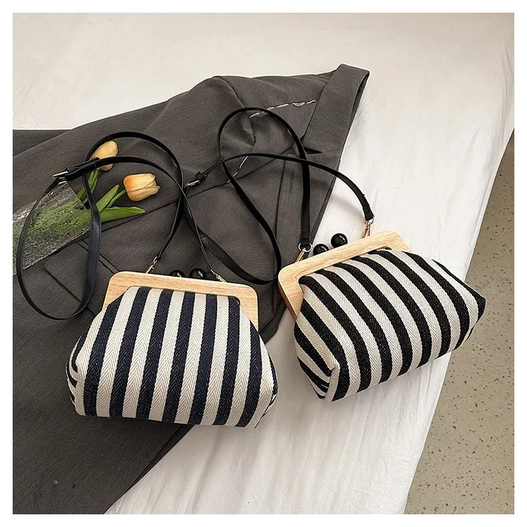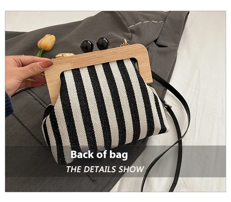 New Striped Canvas Wooden Clip-mouth Clutch