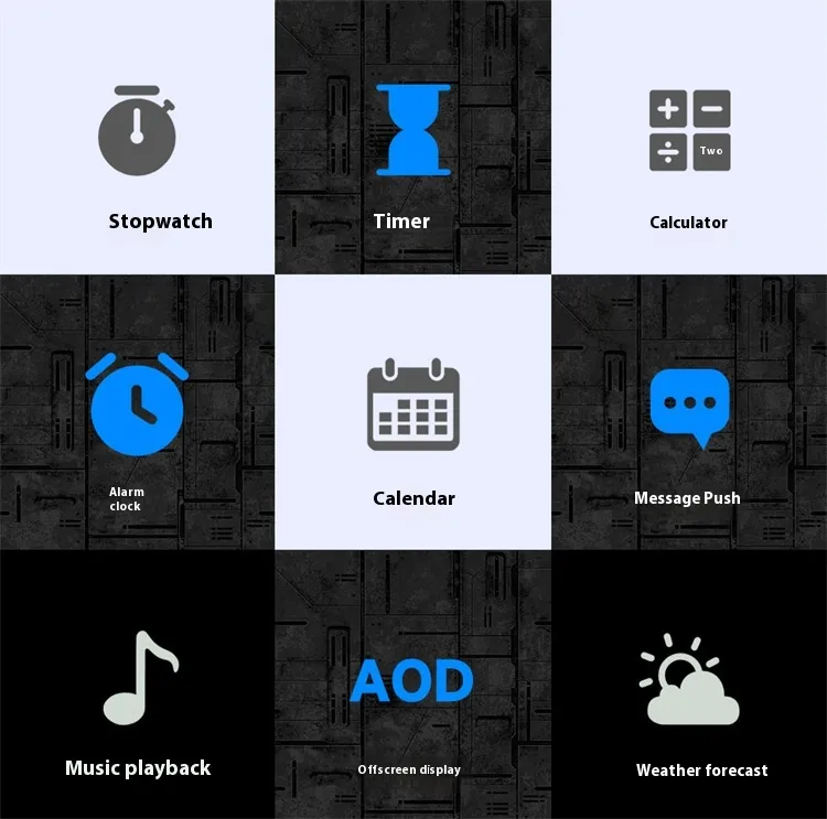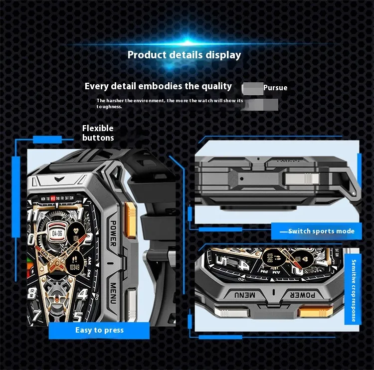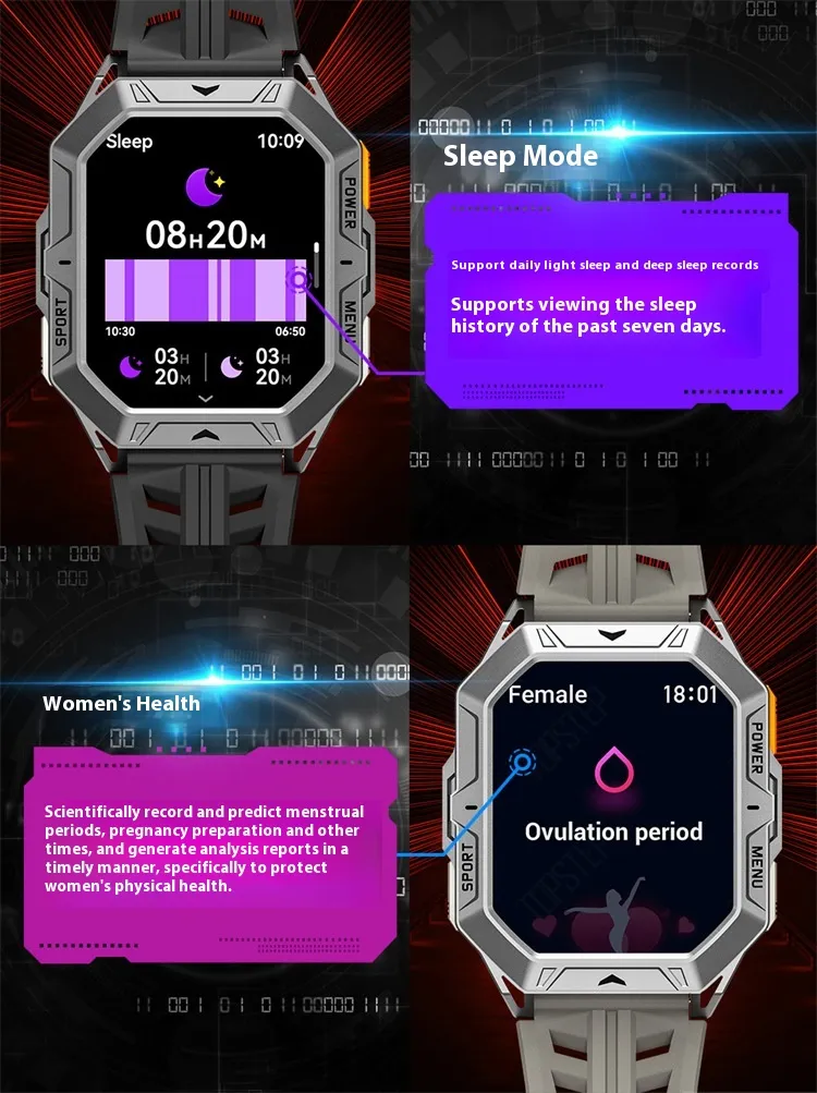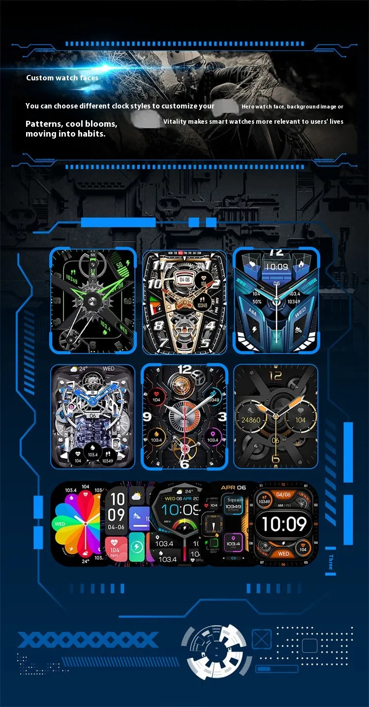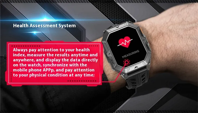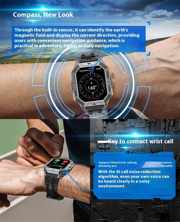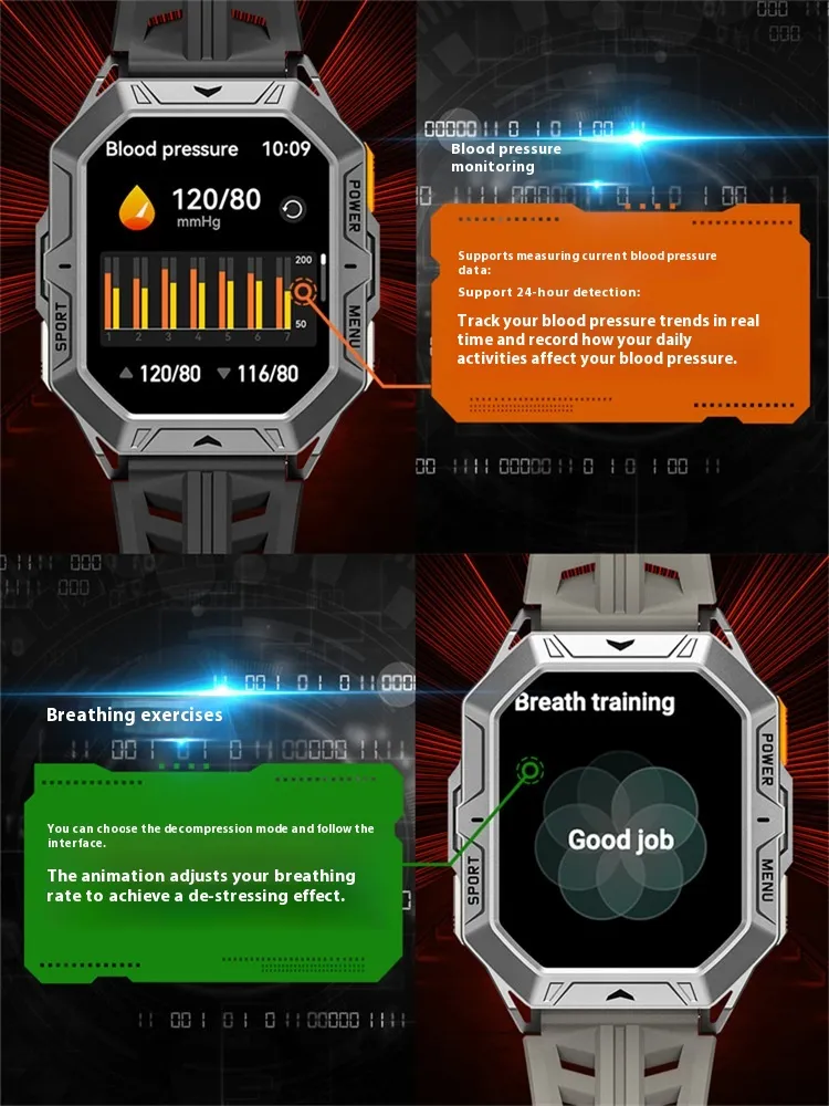 Functions: Waterproof, step counting, heart rate monitoring, blood pressure measurement, social entertainment, Bluetooth calling, smart