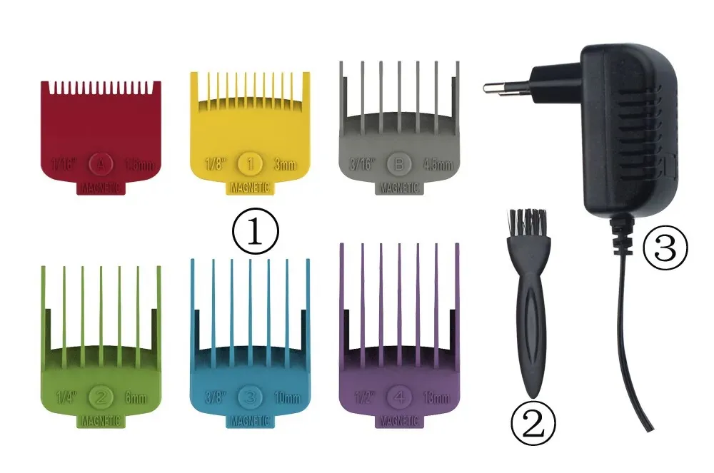 8: Accessories: 6 guide combs (1.5/3/4.5/6/10/13mm) cleaning brushes and adapters.