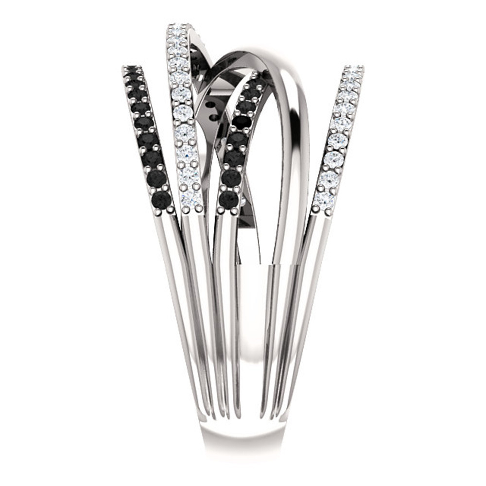 Each band is meticulously adorned with shimmering black and white cubic zirconia stones, offering a stunning contrast that catches the light from every angle. The black stones exude an air of mystery and sophistication, while the white stones add a touch of classic brilliance, making this ring a true statement piece.