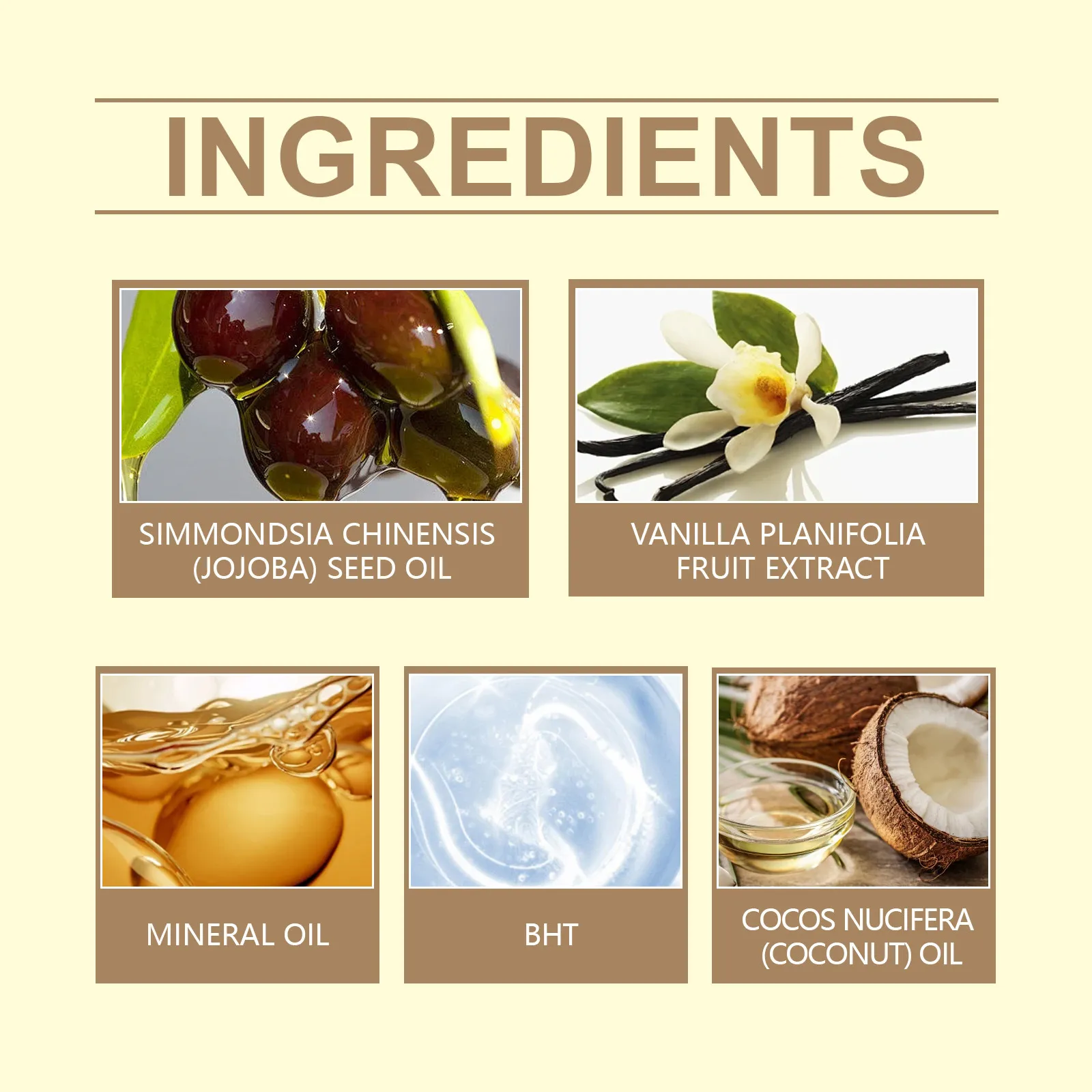Ingredients: mineral oil, butylene, coconut oil, vanilla extract, jojoba seed oil