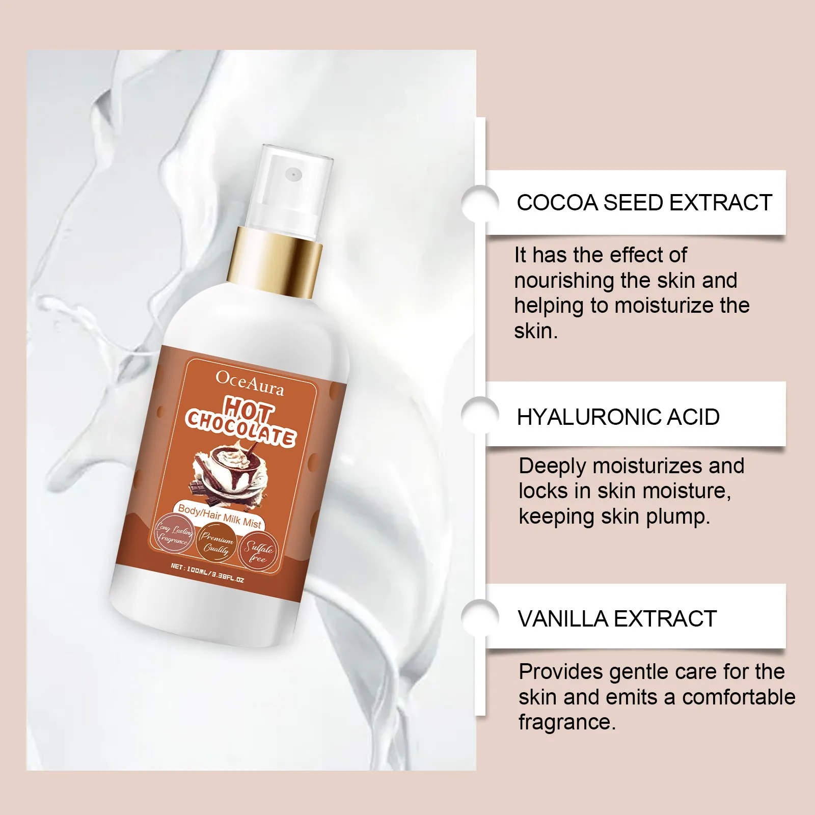 Meta Description: Refresh and hydrate with OceAura Hot Chocolate Body/Hair Milk Mist. Infused with hyaluronic acid, it keeps your skin soft, glowing, and moisturized with a rich chocolate scent.