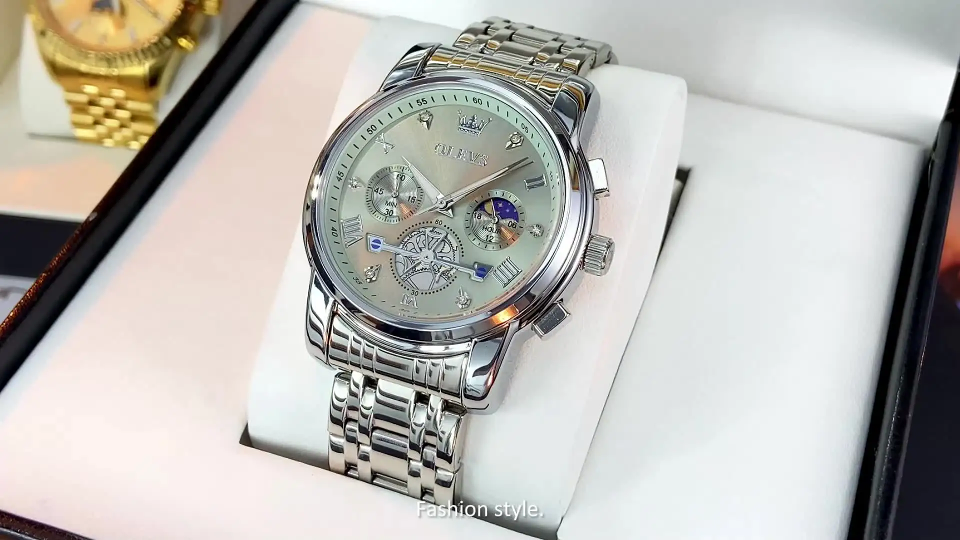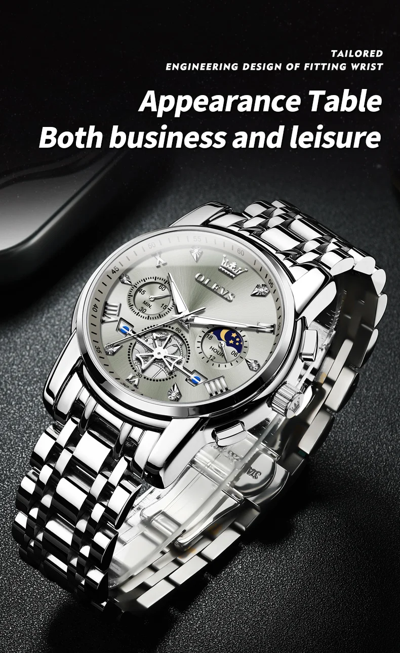 The flywheel design adds a unique touch to this wristwatch, allowing for a glimpse into the intricate mechanics that power the watch. The moon phase indicator and chronograph functionality bring added versatility, while the 24-hour display keeps you organized. Built with a durable case and a comfortable strap, the OLEVS watch combines comfort and sophistication in a single piece. Whether you’re at work, attending a formal event, or out for the day, this watch enhances your look with timeless elegance.