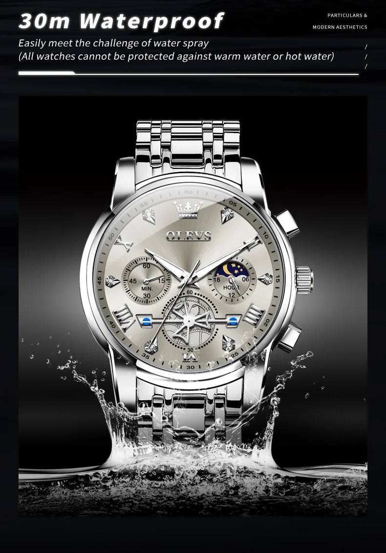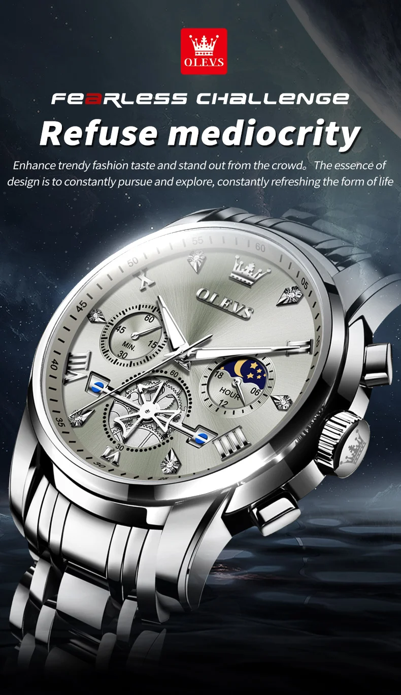 OLEVS Mens Classic Multifunction Quartz Watch Flywheel Chronograph with Moon Phase & 24-Hour Display