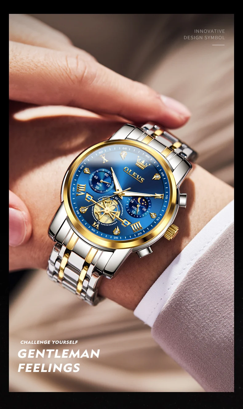 The OLEVS Men’s Classic Quartz Watch is a masterpiece of style, functionality, and innovation, designed for men who appreciate the art of watchmaking. Featuring a multifunctional flywheel chronograph, this timepiece combines elegance with advanced features, including a moon phase display and a 24-hour dial. Crafted with precision and durability in mind, this watch offers a blend of luxury and practicality, making it suitable for both formal and casual occasions. Its high-quality quartz movement ensures accurate timekeeping, while the waterproof construction provides peace of mind for daily wear and various environments.