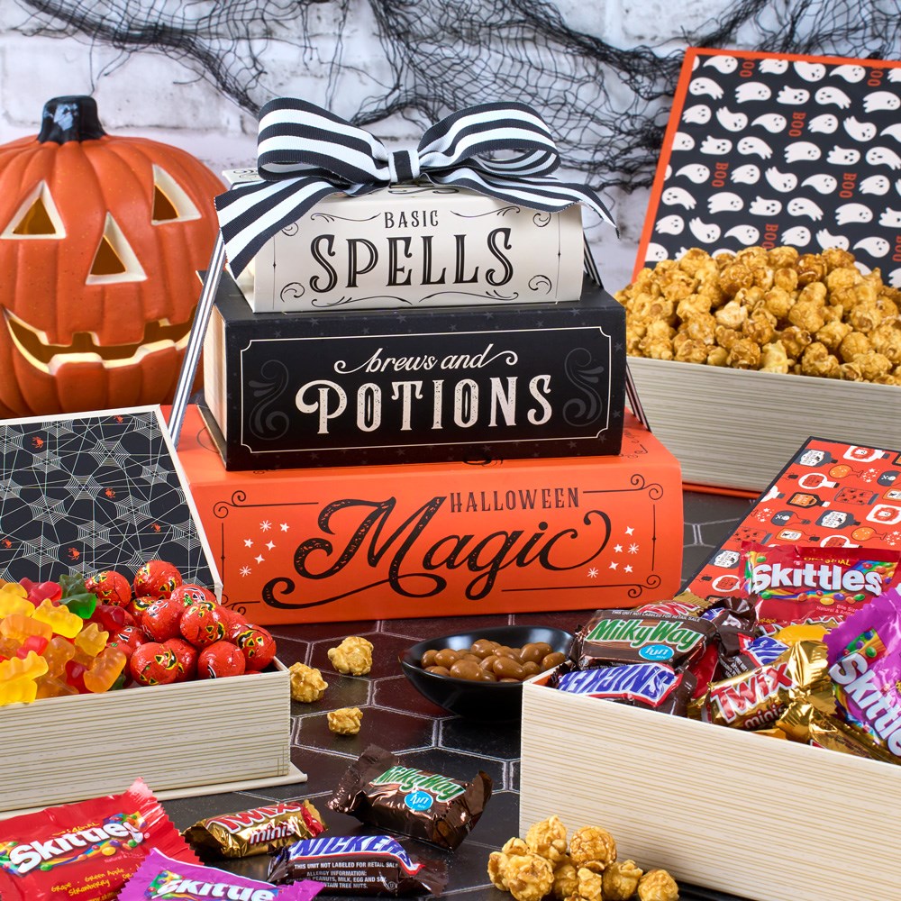 Crafted with a hauntingly playful design, the Open if You Dare Tower is adorned with ghoulish graphics and eerie accents, creating a festive atmosphere that sets the mood for Halloween celebrations. Each box within the tower is filled with themed treats that are both fun and tasty, making it an excellent centerpiece for Halloween parties or family gatherings. The assortment is perfect for sharing among friends and loved ones, adding excitement to festive events as each layer is unveiled. Whether you’re hosting a party or giving it as a gift, this treat tower offers a delightful way to enjoy Halloween.