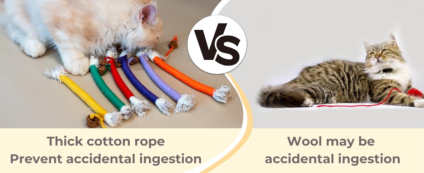 - QUIET PLAY: Including 3pcs 19.7" and 3pcs 7.9" cat chew ropes to meet your cat's multiple needs. These soft colorful cat rope toys provide quiet self play time in the night without bothering cat owner's sleep. Different cats react differently to this cat toy. If your cat doesn't like the cat toys, please contact us for a satisfied solution.