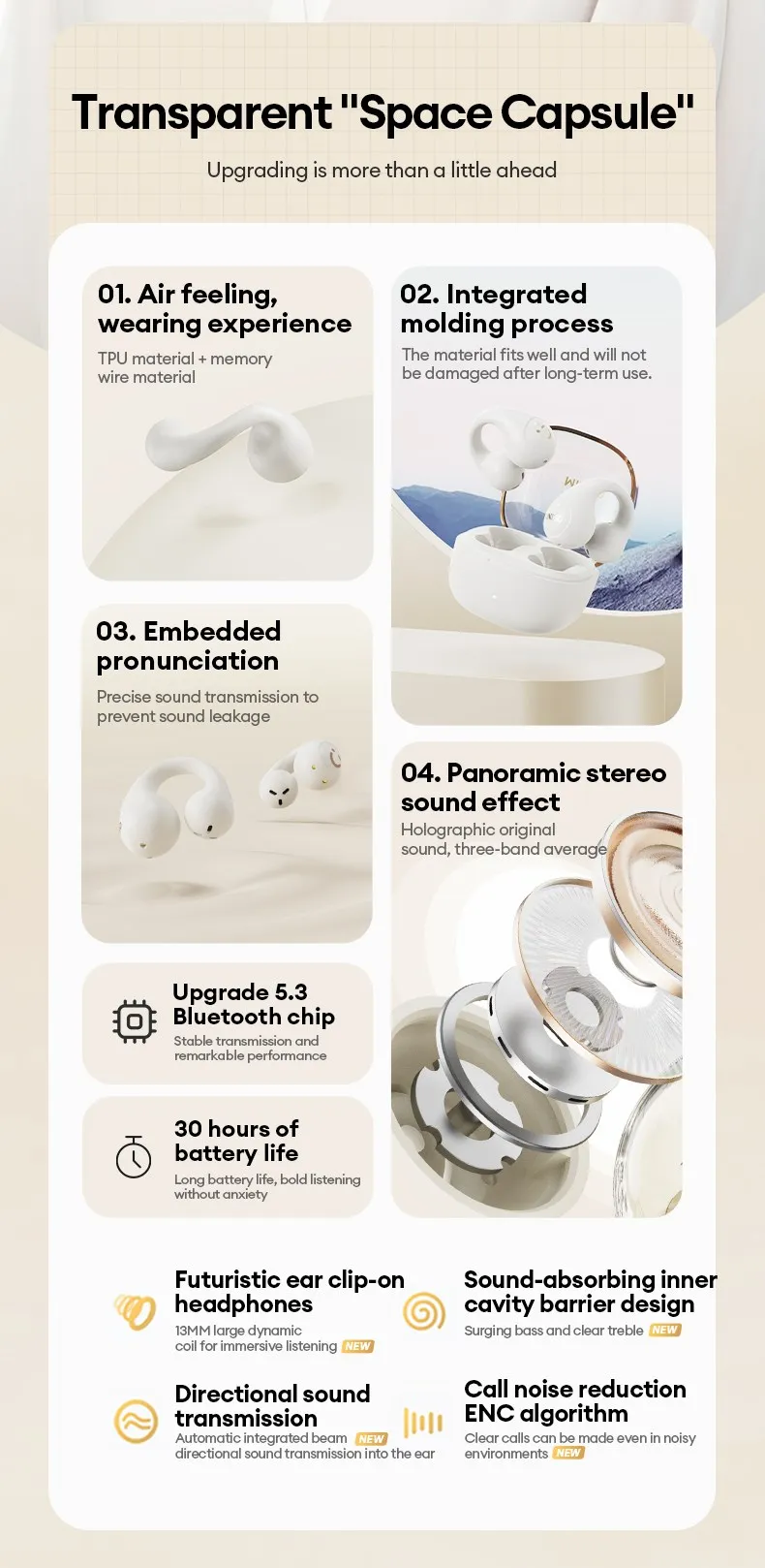 - Ear Clip Design: The ergonomic ear clip design ensures a secure and comfortable fit, even during vigorous physical activity. This feature helps keep the earbuds in place, providing a stable listening experience.