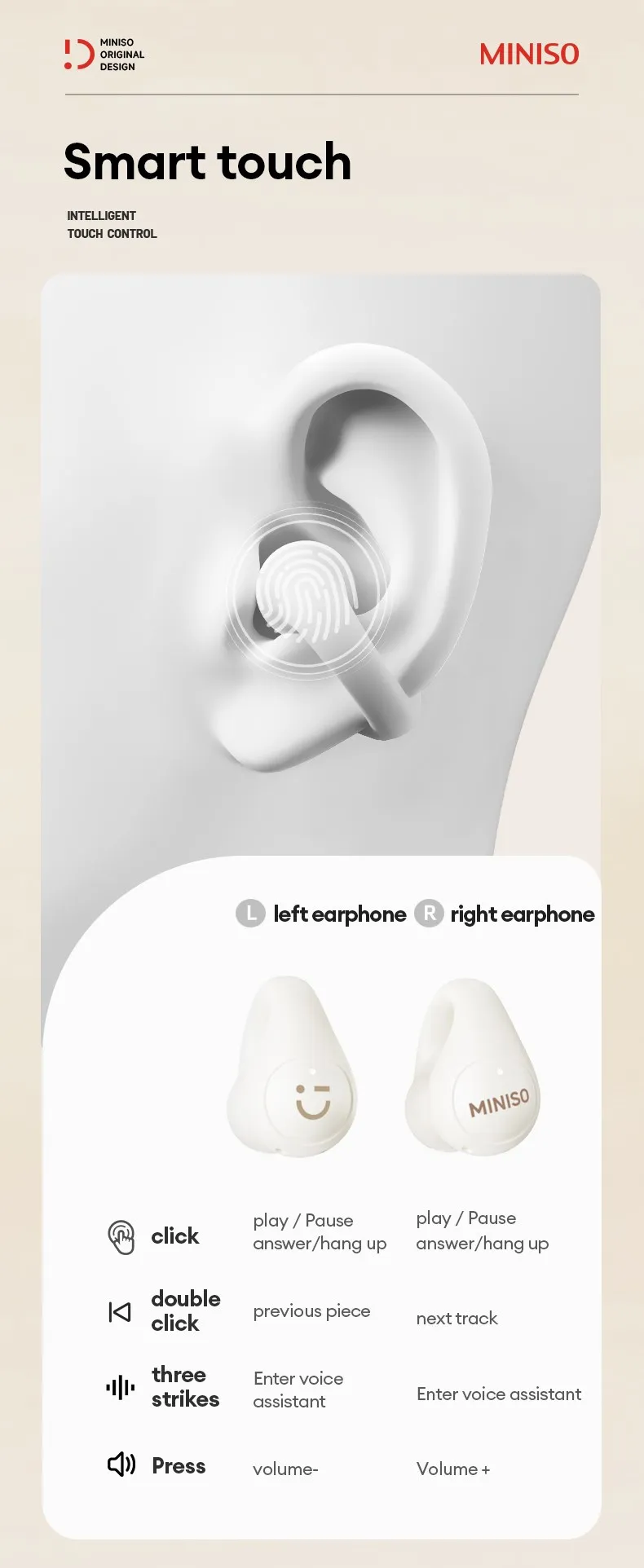 Original MINISO MCT09 Wireless Bluetooth V5.3 Earphones Touch Control Ear Clip Music Earbuds, Sport Running Headset with Mic