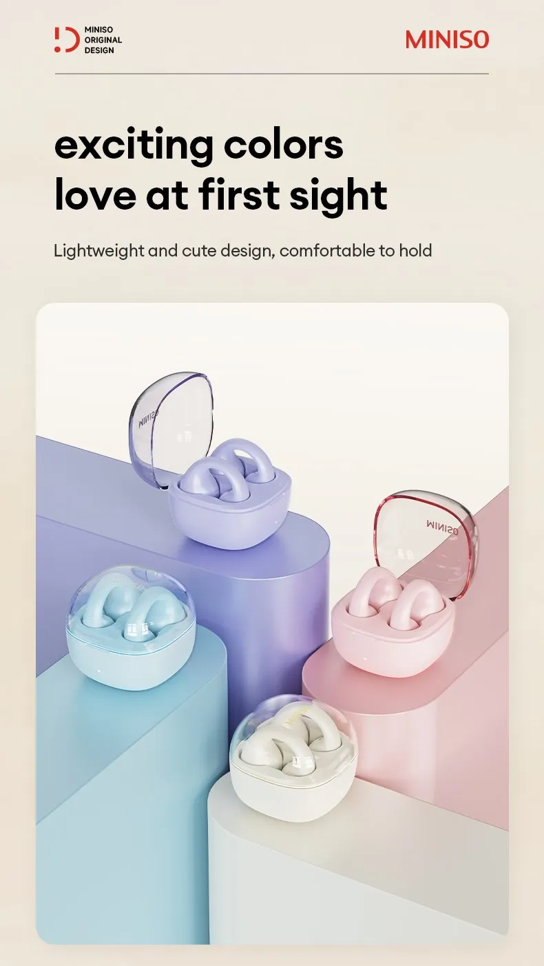 The MINISO MCT09 Wireless Earphones boast a sleek and ergonomic design that combines style with functionality. The compact, lightweight earbuds are designed to fit securely in your ears, thanks to the innovative ear clip design that helps prevent them from falling out during intense activities. The touch control panels on each earbud are seamlessly integrated into the design, allowing for intuitive operation without the need for physical buttons. The modern aesthetic and variety of colors make these earphones a stylish accessory for any outfit.