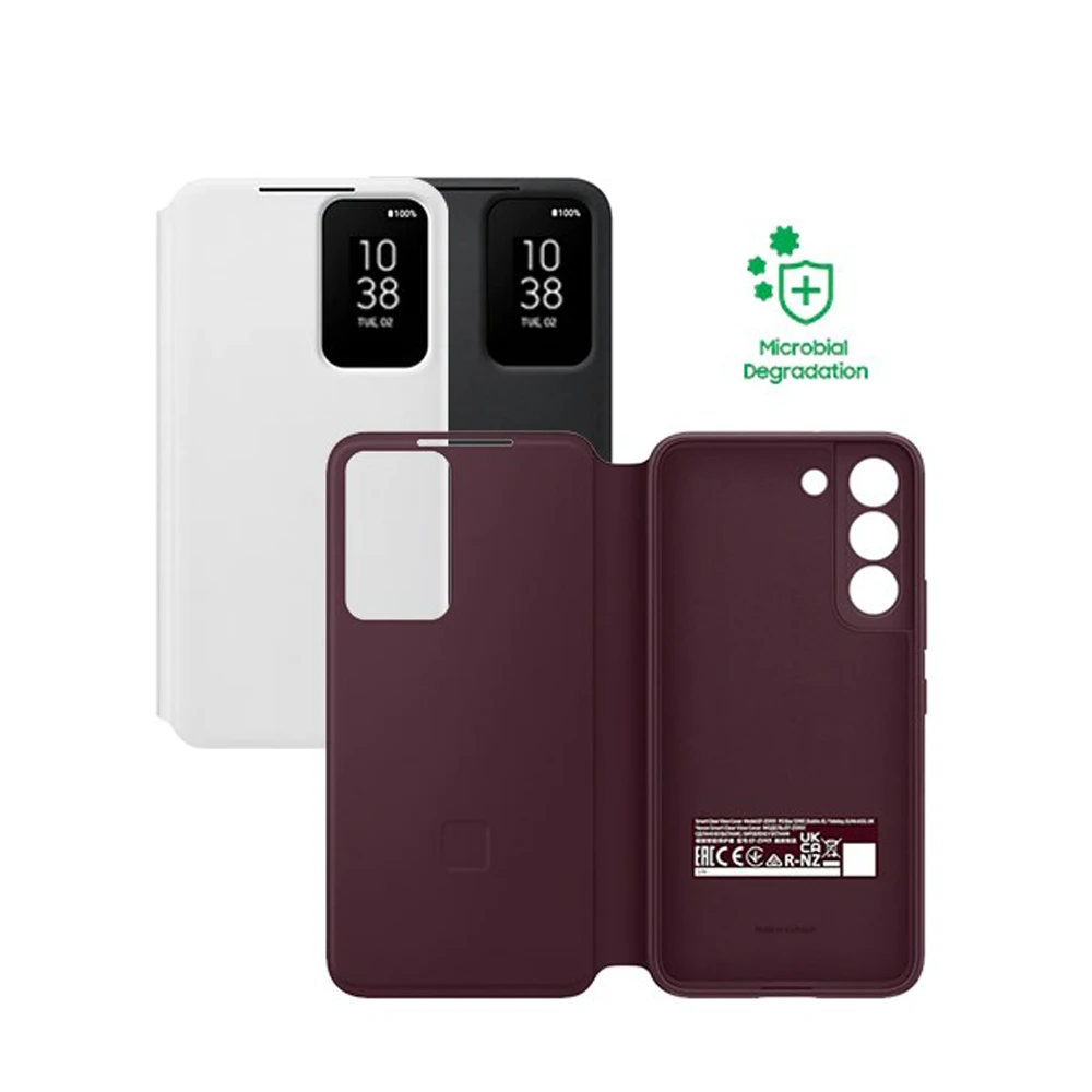 The Original Samsung Clear View S-View Flip Cover is designed for the Galaxy S22 and S22+. This shockproof case, model EF-ZS901 and EF-ZS906, provides comprehensive protection while allowing you to view notifications and interact with your phone without opening the cover. The sleek and durable design ensures your device stays protected from impacts and scratches.Helps keep your phone clean*
