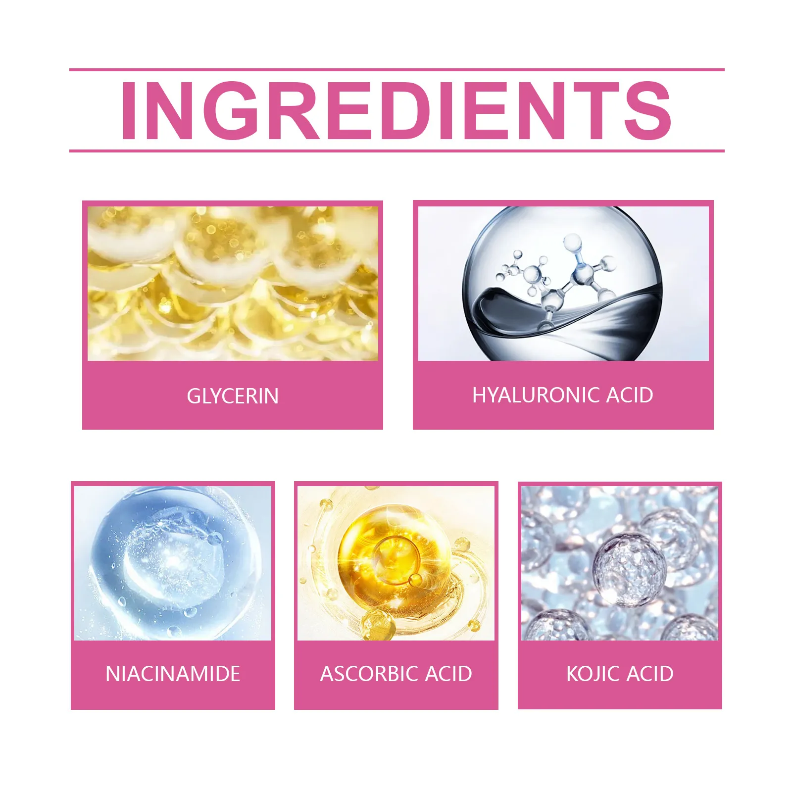 Ingredients: glycerol, hyaluronic acid, vitamin C, nicotinamide, kojic acid