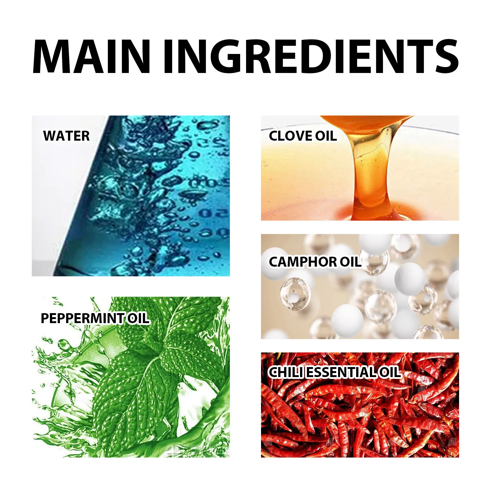 - Ingredients: Water, clove oil, peppermint oil, camphor oil, pepper essential oil