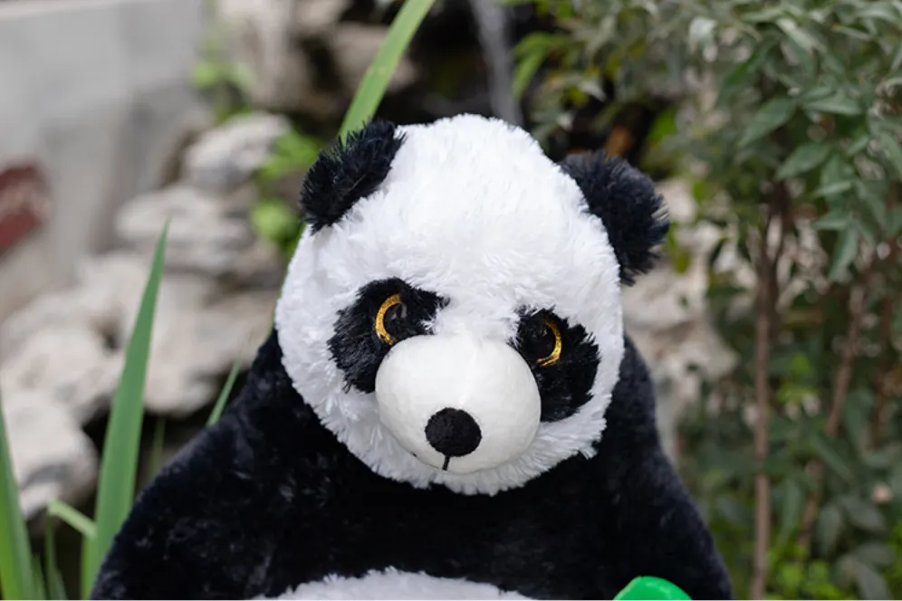 The panda is depicted holding a bamboo stalk, which adds a playful and interactive element to the design. The bamboo helps complete the panda’s natural look and provides a fun feature that children can explore and use in their imaginative play. The stalk is typically made from soft, flexible materials that ensure it’s safe for children to handle.