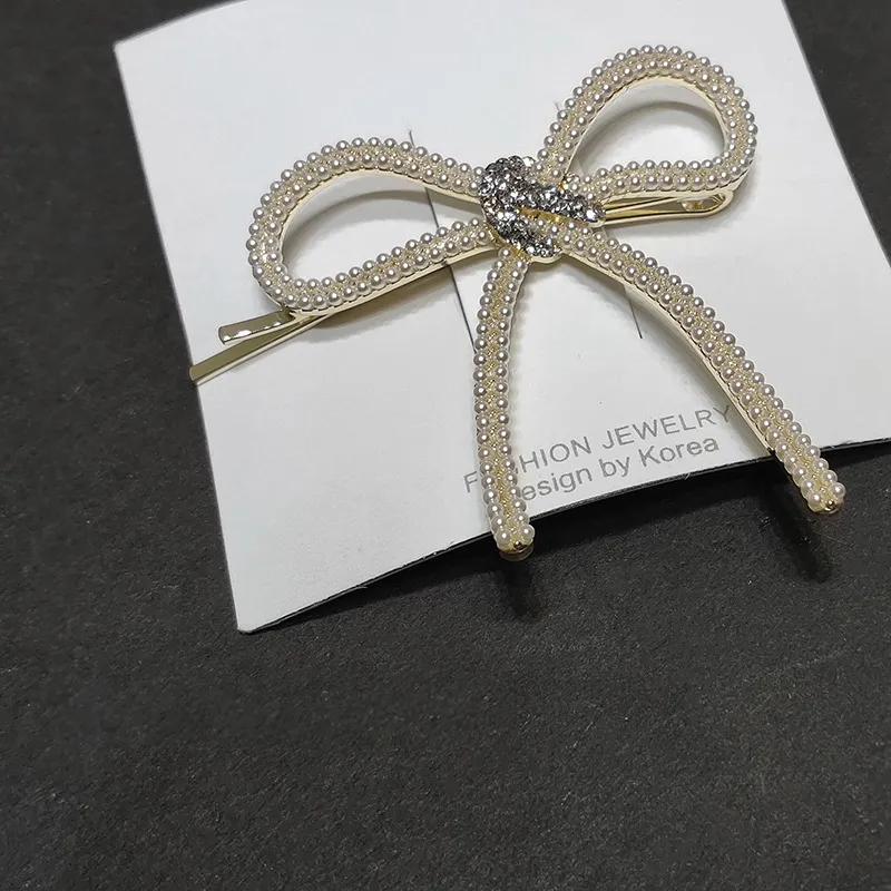 Adorning the bow are lustrous pearls and sparkling diamonds (or high-quality rhinestones), which catch the light beautifully and create a stunning, luxurious effect. The combination of the smooth, classic pearls and the bright, radiant diamonds creates a balanced and sophisticated look, adding a layer of refinement to any hairstyle.