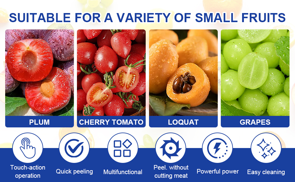 - 【Perfect for Small Fruits & Garlic】Specially designed for delicate fruits and vegetables. Easily peels small fruits like grapes, cherry tomatoes, and garlic without bruising. Ideal for preparing fresh snacks, salads, sauces, and baking prep. A versatile peeler machine that’s perfect for busy kitchens.