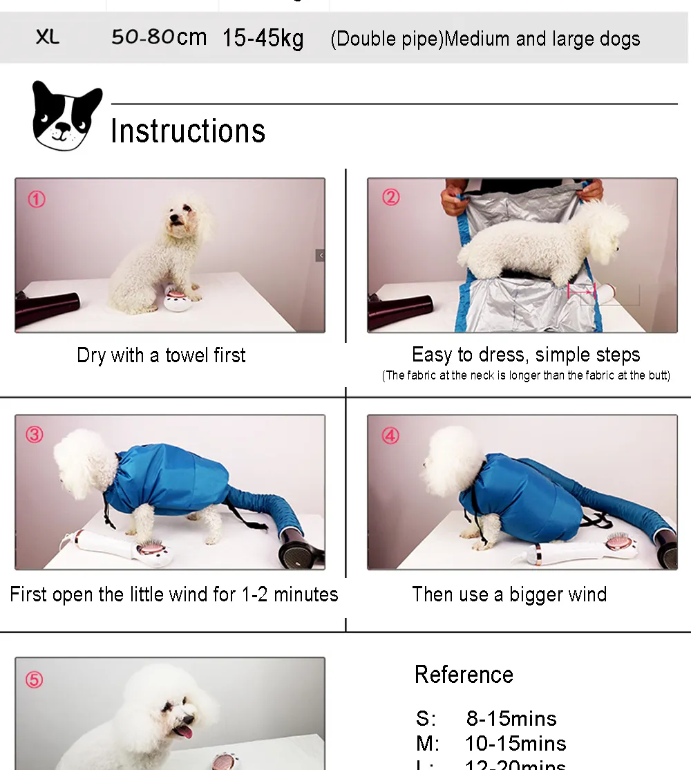 3. Easy to Use: Only need a normal household hairdryer can quickly dry the pet's hair in a few minutes, so that pet bathing convenient.