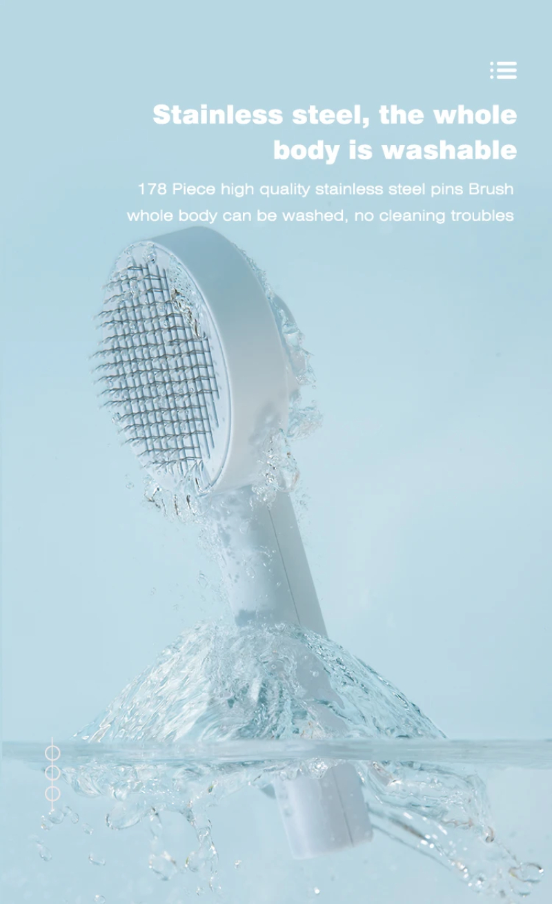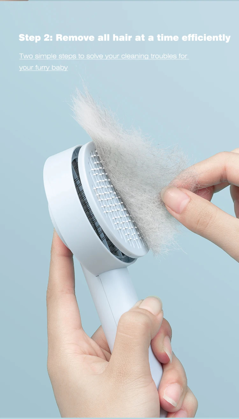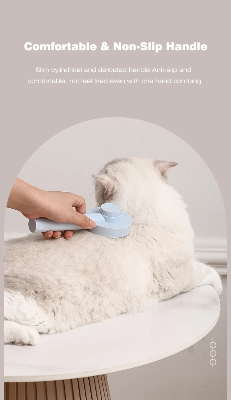 3. One-touch cleaning button: Press the cleaning button to retract the bristles and wipe away the hair. Hair falls out of the brush easily. Our pet brushes are washable to keep the brush hygienic.