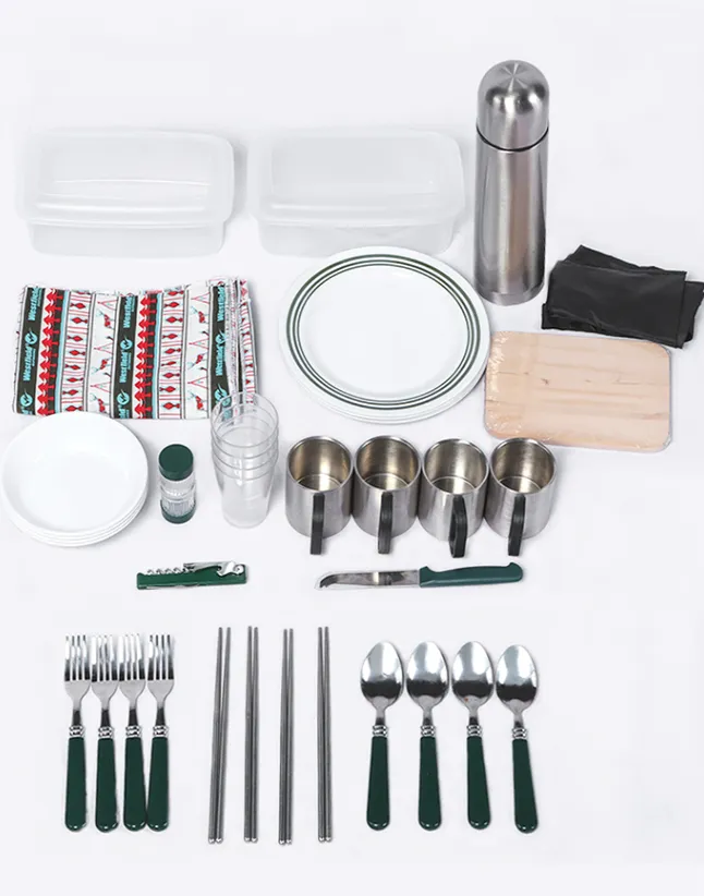outdoors. The cutlery is stainless steel, the plates are sturdy, and the cups are made from eco-friendly materials.