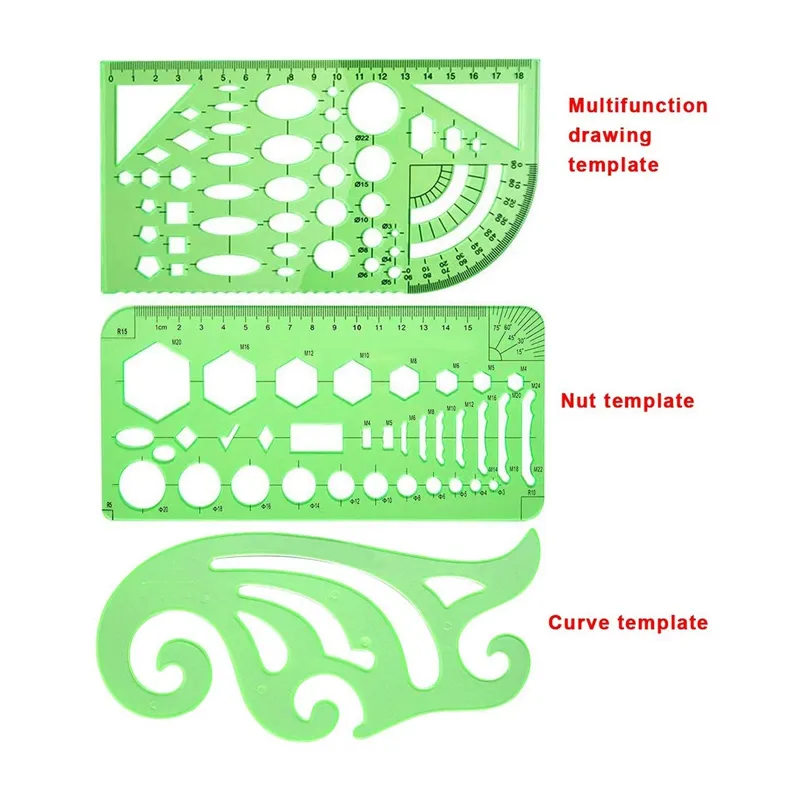 11pcs drawing templates:1 * Curve template, 1 * Network technique template, 1 * Geometric drawing template, 1 * Mechanical template, 1 * Nut template, 1 * Building template, 1 * Mathematics learning template, 1 * Circular template, 1 * Multifunctional drawing template, 1 * Ellipse template, 1 * Orthodrome template