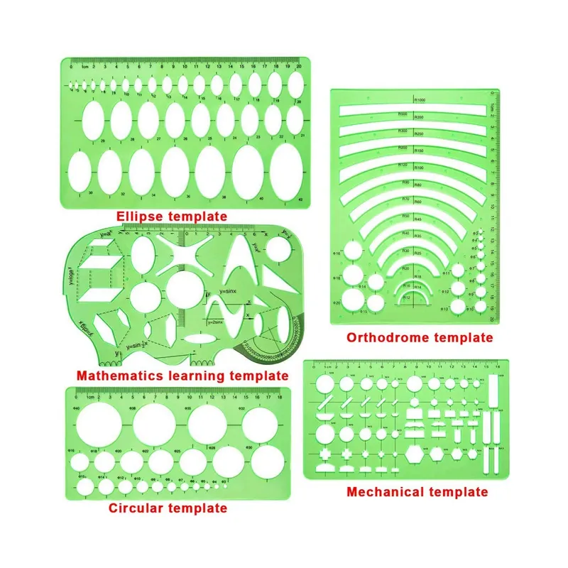 11pcs drawing templates:1 * Curve template, 1 * Network technique template, 1 * Geometric drawing template, 1 * Mechanical template, 1 * Nut template, 1 * Building template, 1 * Mathematics learning template, 1 * Circular template, 1 * Multifunctional drawing template, 1 * Ellipse template, 1 * Orthodrome template