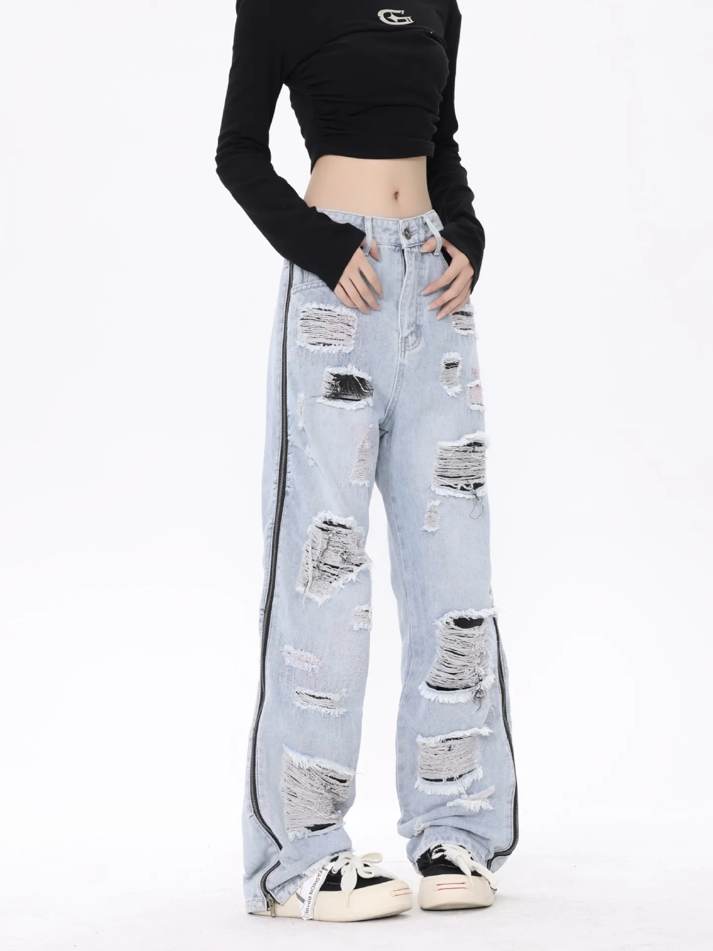 outfit. The distressed look can vary from subtle frayed hems to bold, larger rips, giving you the freedom to choose the style that best
